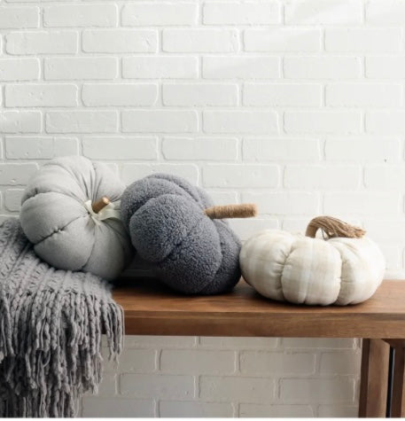 Add a touch of cozy charm to your Fall and Halloween decor with this Sherpa Grey Pumpkin Cushion. Its modern grey hue pairs perfectly with seasonal tones, while the soft sherpa texture invites snuggles. Finished with a rustic jute stem, it brings a playful yet stylish vibe to your space—perfect for festive gatherings or simply welcoming autumn’s cozy spirit. Measures 12" x 6" high. Polyester/Cotton.