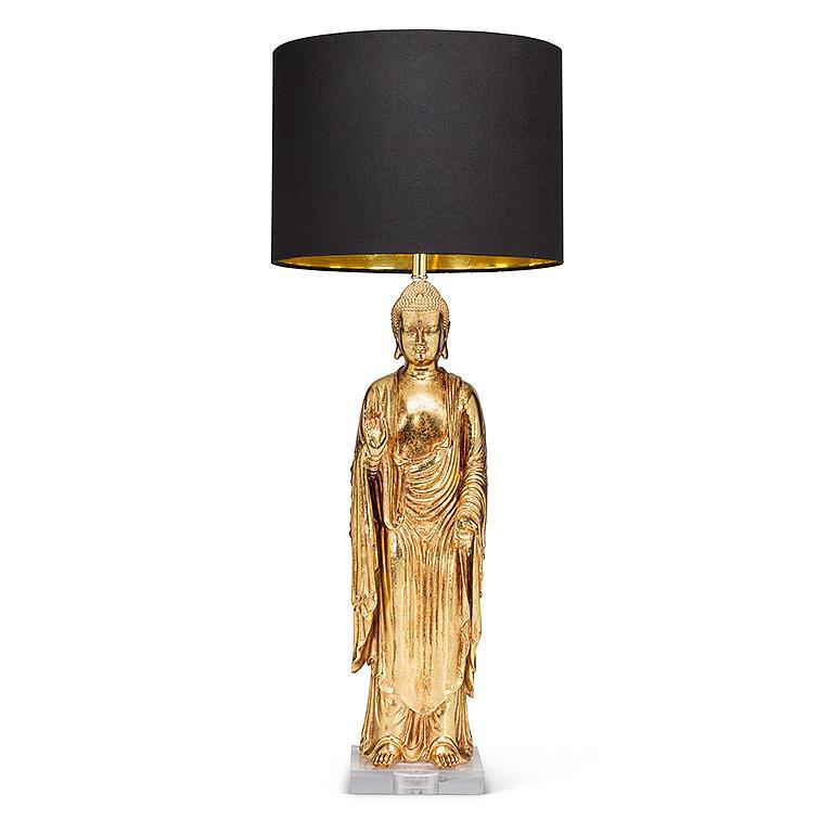 Add some personality – and a little Zen – to any room with this Standing Buddha Table Lamp. Crafted out of resin and polyester, this lamp features a highly detailed sculpt of a golden Buddha, accented with a chic matte-black lamp shade to help bring tranquility — and light! – anywhere. Back by popular demand!