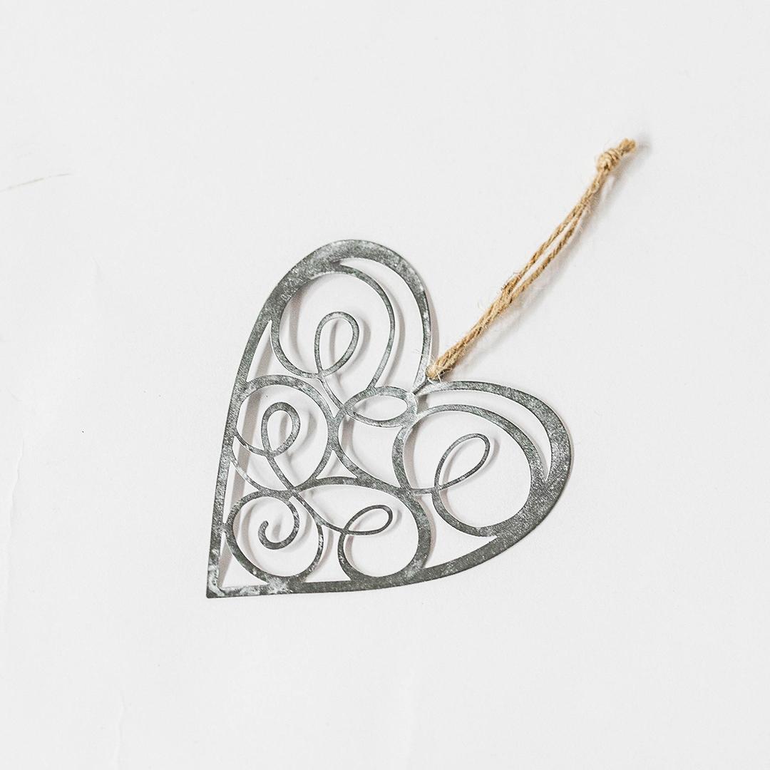 Introducing our Swirly Metal Heart Ornament, perfect for adding a touch of vintage charm to any space. Made of antique grey metal, with a romantic swirly design, this heart-shaped beauty can be hung on a jute rope to keep the love in all year long.