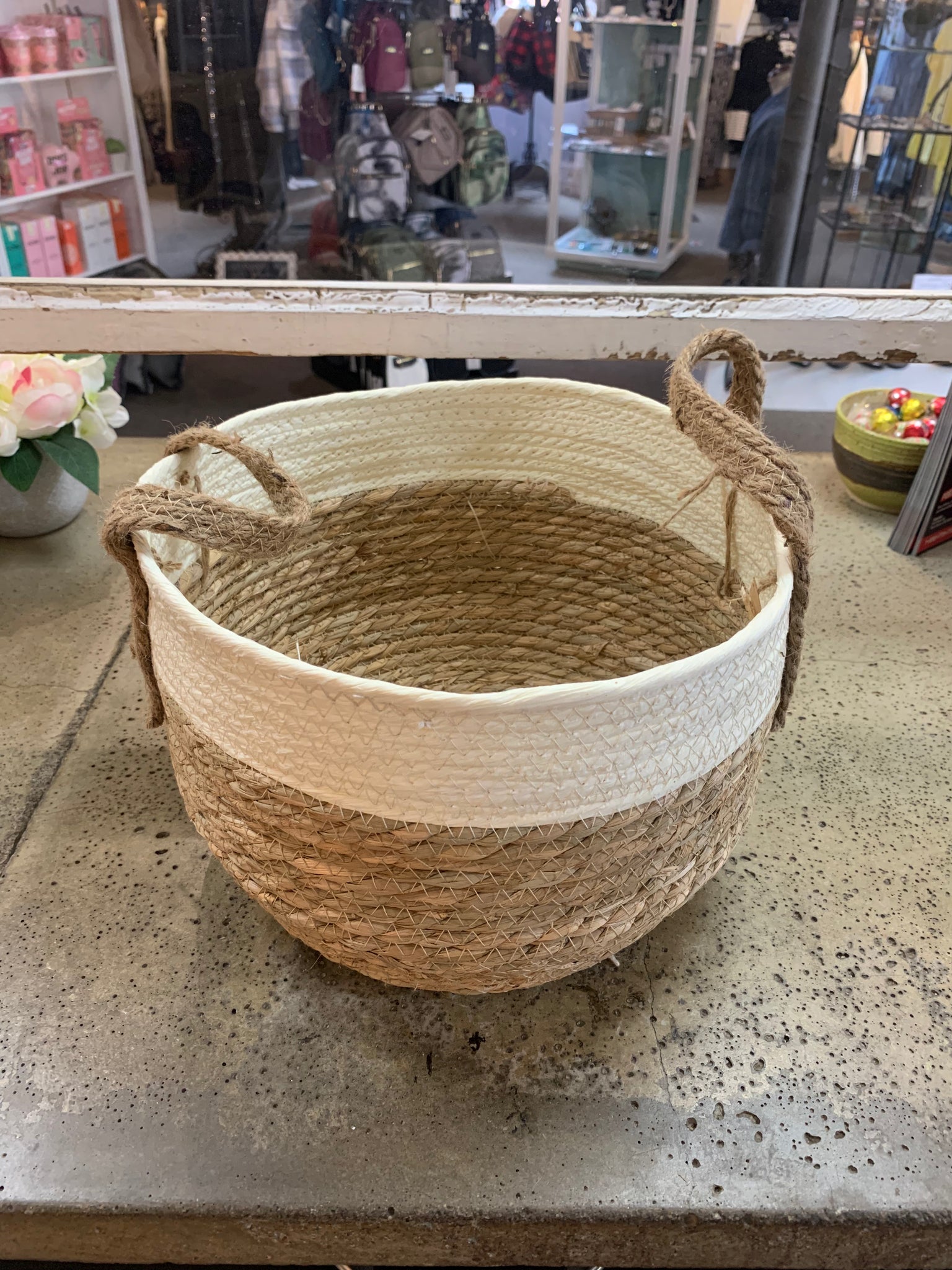 Bring rustic charm to your home with our two-tone baskets. Crafted of natural plant materials for lasting quality, each basket features two toned color and jute handles for easy carrying. Cottage style makes them perfect for organizing and storage. Available in three sizes.