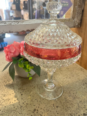 Vintage Cranberry Glass & Diamond-Point Glass Candy Dish