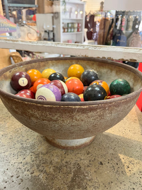 Vintage Billiard Balls in Steel Bowl