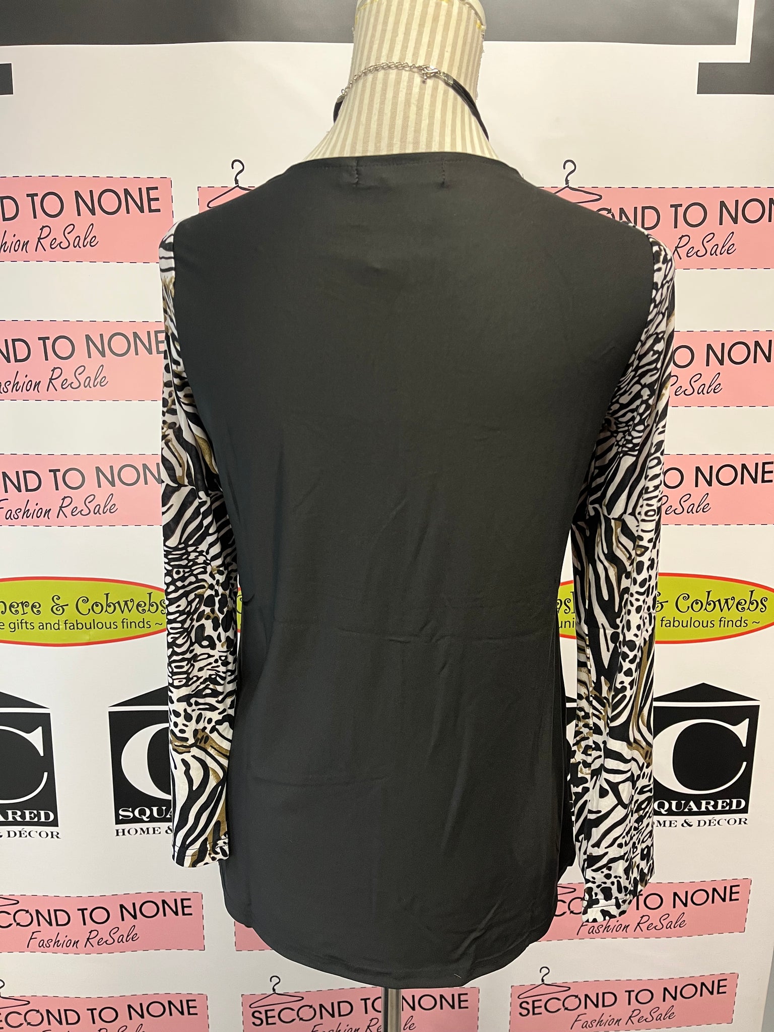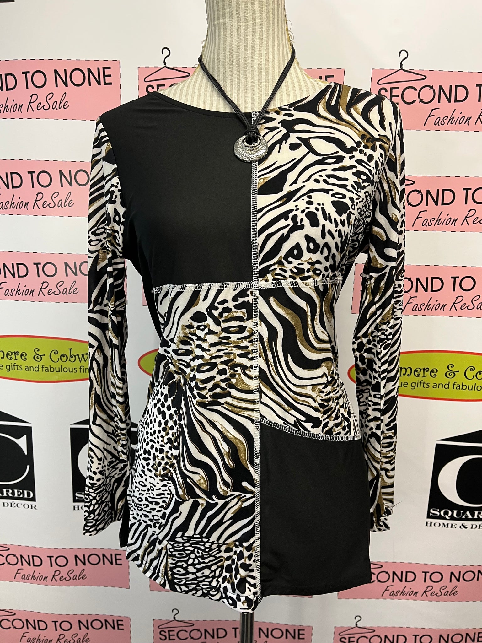 Embrace your wild side with the Animal Print Block Top, featuring a bold animal print paired with sleek solid black blocks. This lightweight top is perfect for layering under jackets or vests, making it a versatile piece for any occasion. Its wrinkle-resistant fabric ensures you look sharp whether you’re at work, out with friends, or traveling. Effortlessly stylish, it’s your go-to top that plays well with anything, anywhere.  Fiori brand.  95% polyester/5% spandex.