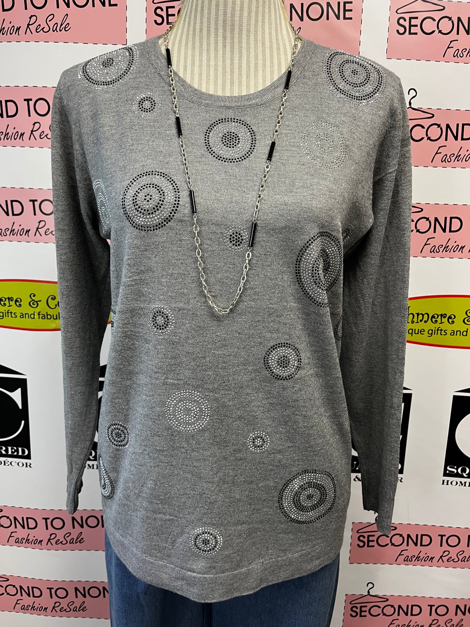 This grey long sleeve top brings sparkle to your everyday look with its silver and black gem circle design. Made from stretchy fabric, it moves with you while adding a touch of playful shine. Perfect for adding a bit of glam to casual days or nights out.