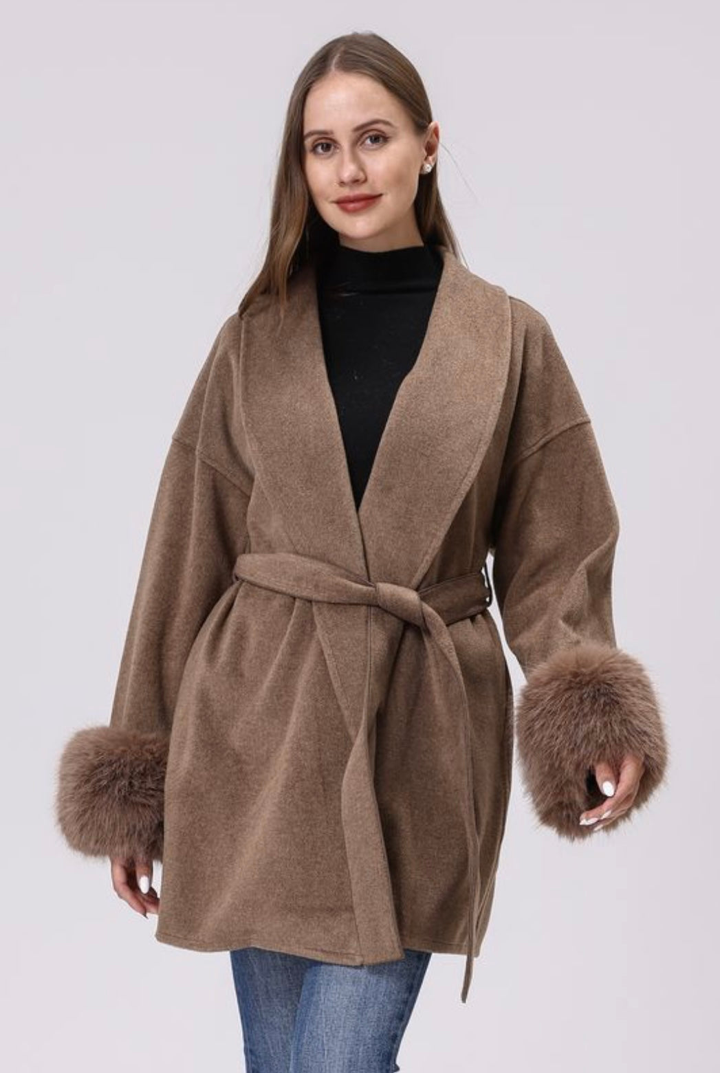 Throw this effortless belted coat over anything and instantly elevate your look. Whether you're dashing out for errands, hitting the shops, or layering it over jeans or a dress, it strikes the perfect balance between casual and polished. The faux fur cuff adds a touch of glamour, while the one-size-fits-most design means less thinking and more doing. Wear it as a statement coat or a chic jacket—either way, you've got style sorted.  Available in Taupe & Black.