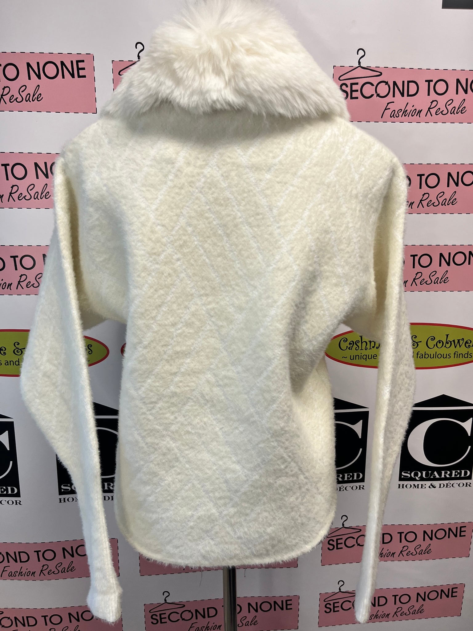 Wrap yourself in cozy charm with this Faux Fur-Collar Zipper Front Cardigan. Super soft and snuggly, it features a zipper front with a playful ring toggle and a touch of vintage flair. Removable collar & 2 pockets. Textured with a zig-zag type pattern. Wear it over your favorite top or rock it solo as the star of your outfit. Perfect with jeans, leather pants, or dressed up with palazzo pants, it’s the versatile piece your wardrobe’s been waiting for. Evidence brand.