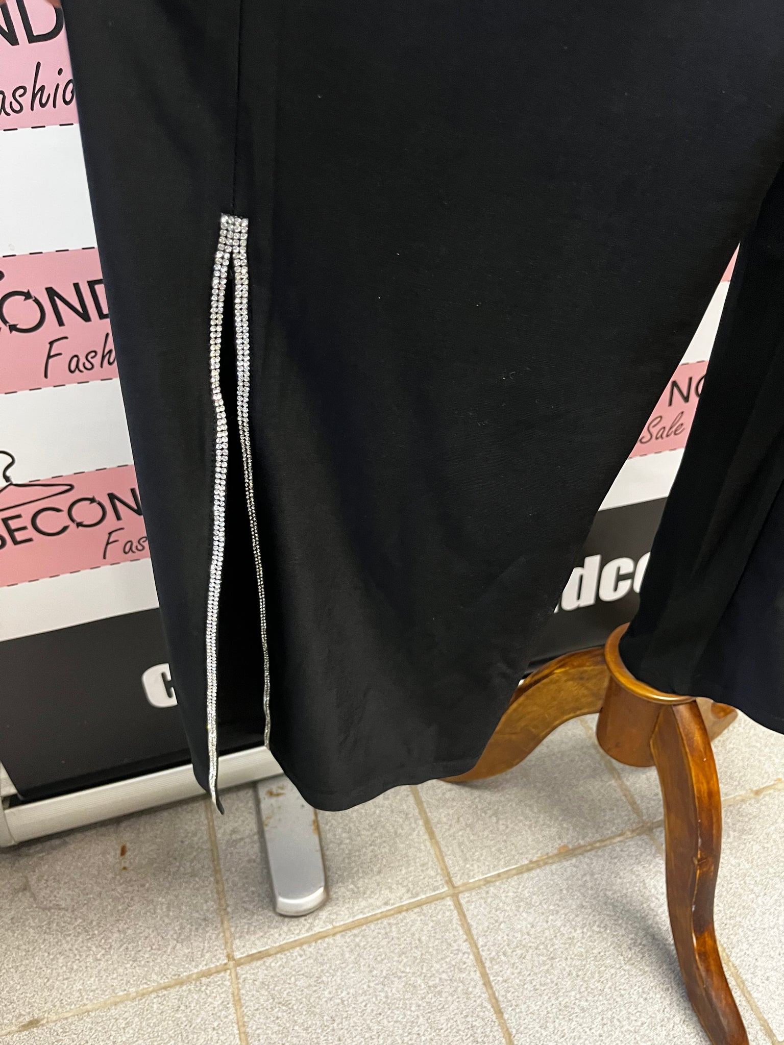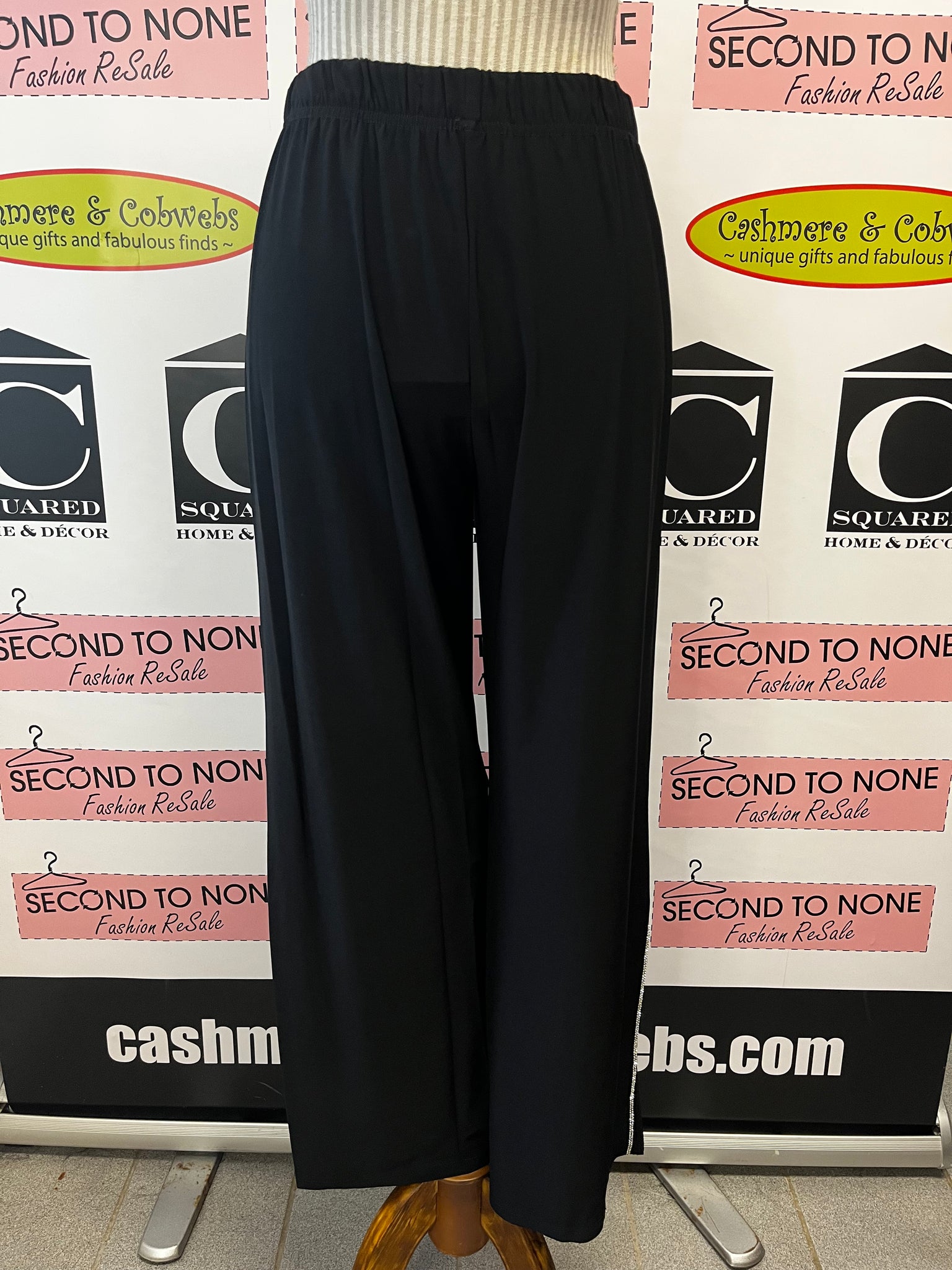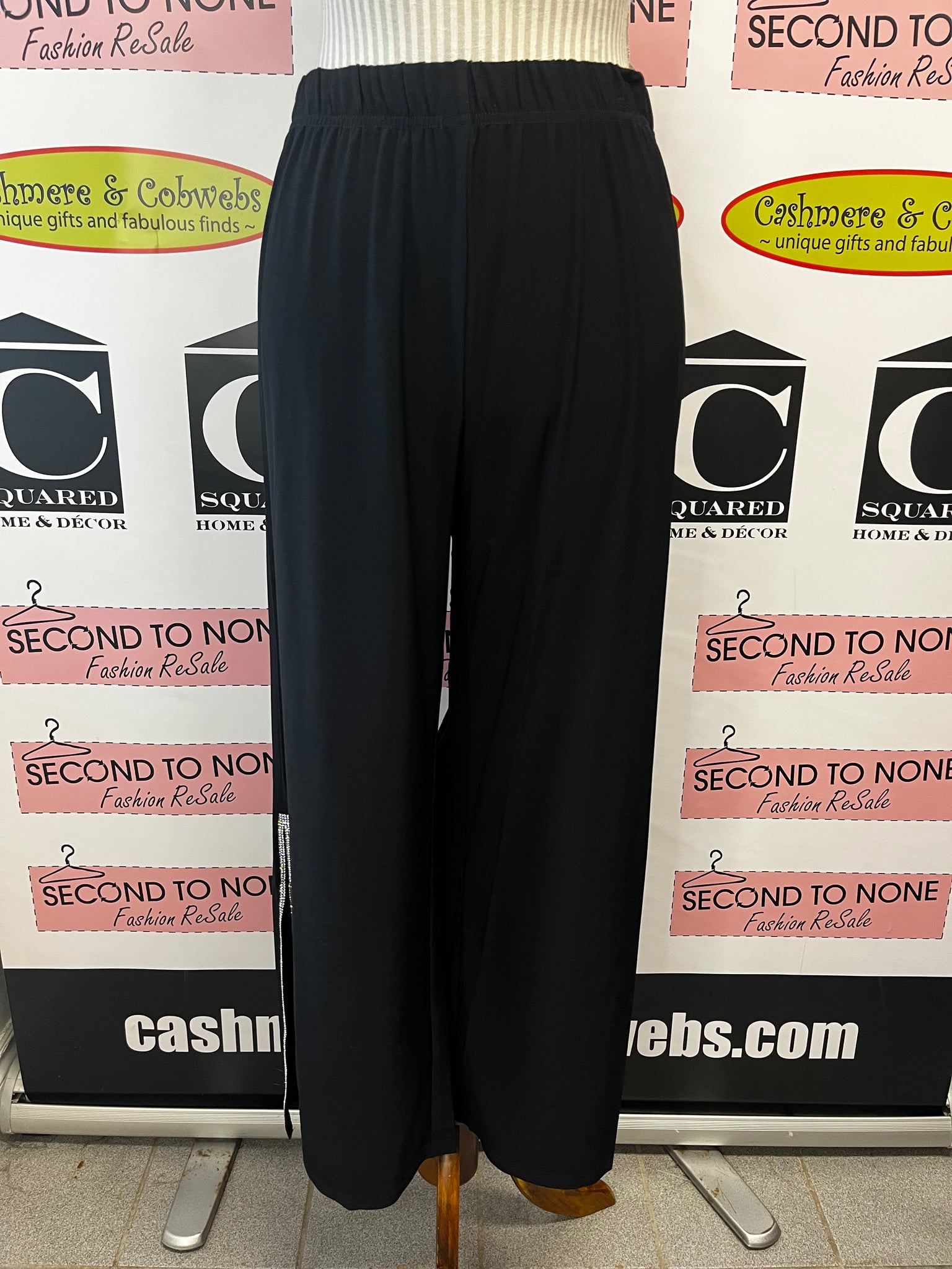 Elevate your evening look with these Rhinestone-Slit Eveningwear Pants, featuring dazzling bling along each side of both leg slits for a touch of sparkle. Made from light-weight stretch fabric with a pull-on elastic waist, they offer comfort and style in perfect harmony. Ideal for your next cruise or a fancy affair, these pants add just the right amount of glam to your wardrobe with a playful edge. Kleio brand. 96% polyester/4% spandex.
