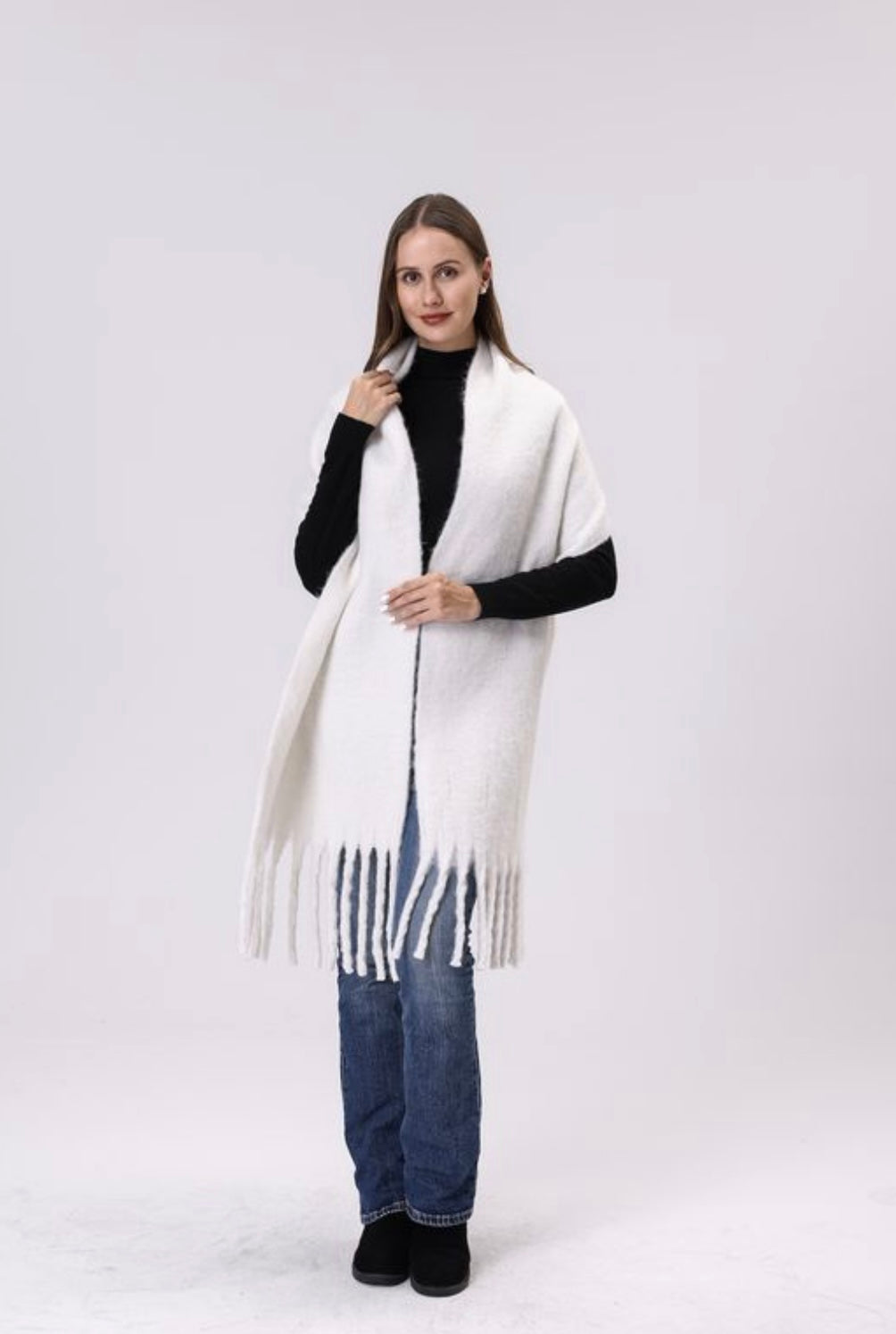 Wrap yourself in cozy versatility with this essential blanket scarf. Perfect for layering over your winter coat or snuggling up at home, it's the ultimate comfort companion that pairs effortlessly with any outfit. Available in four timeless colors, it's a thoughtful gift that keeps on giving warmth and style all season long. Choose from brown, lt. blue, red, white. 70% viscose/30% wool. Measures. 16" x 78"