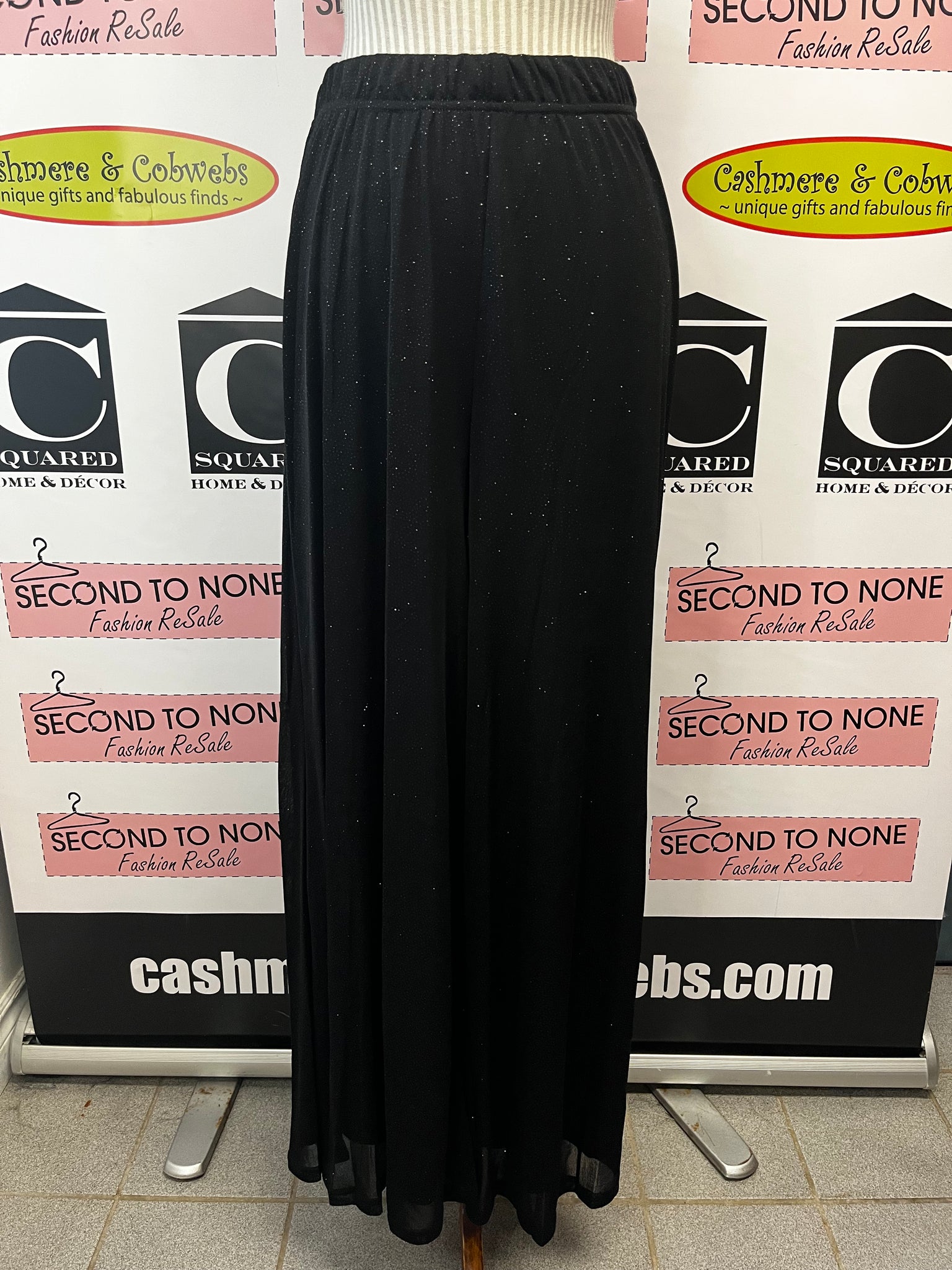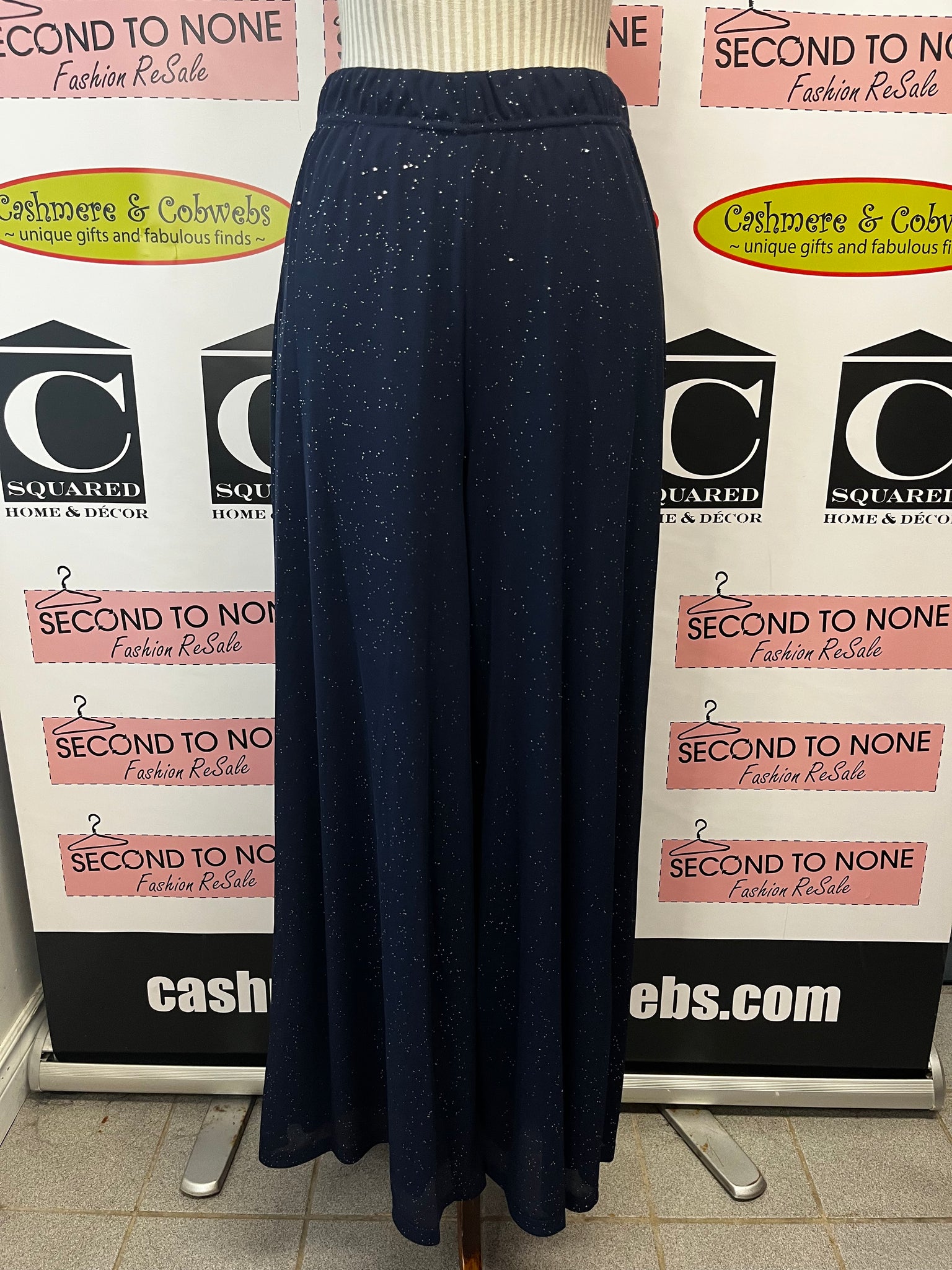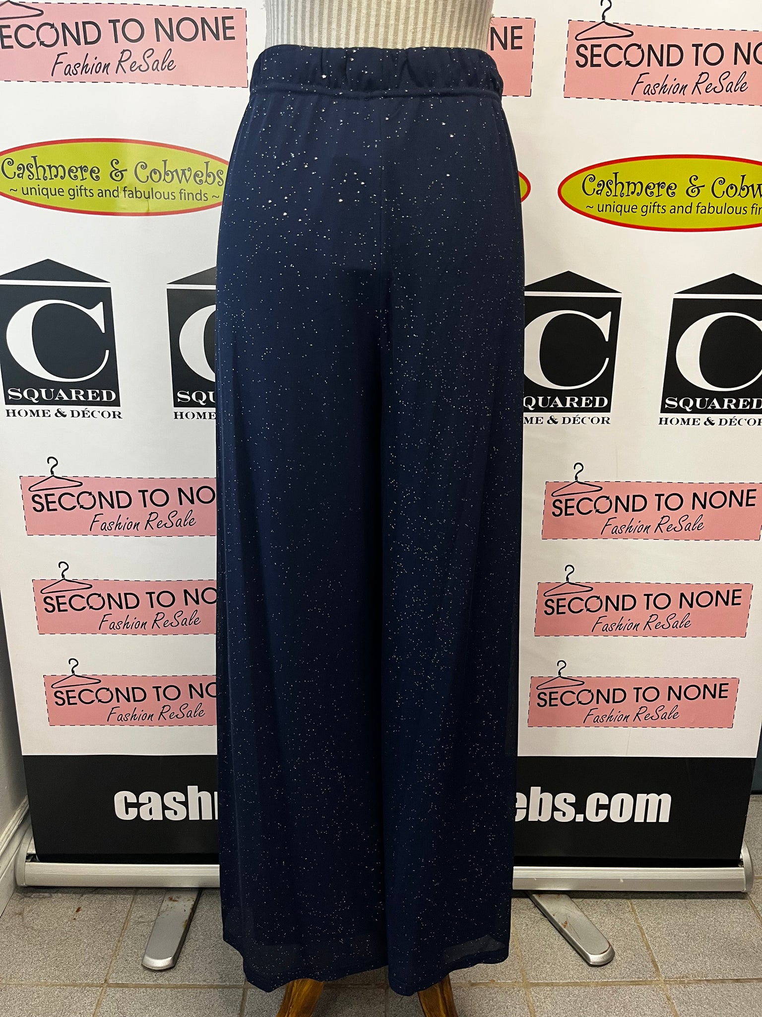 Step into celebration mode with these Sparkly Palazzo Pants in navy and black. Their flowy silhouette and subtle all-over sparkle front and back make them perfect for cruises, holidays, or weddings. Fully lined with an elastic waist, they offer style and comfort for any party. Your new favorite pants await! 96% polyester/4% spandex. Kleio brand.