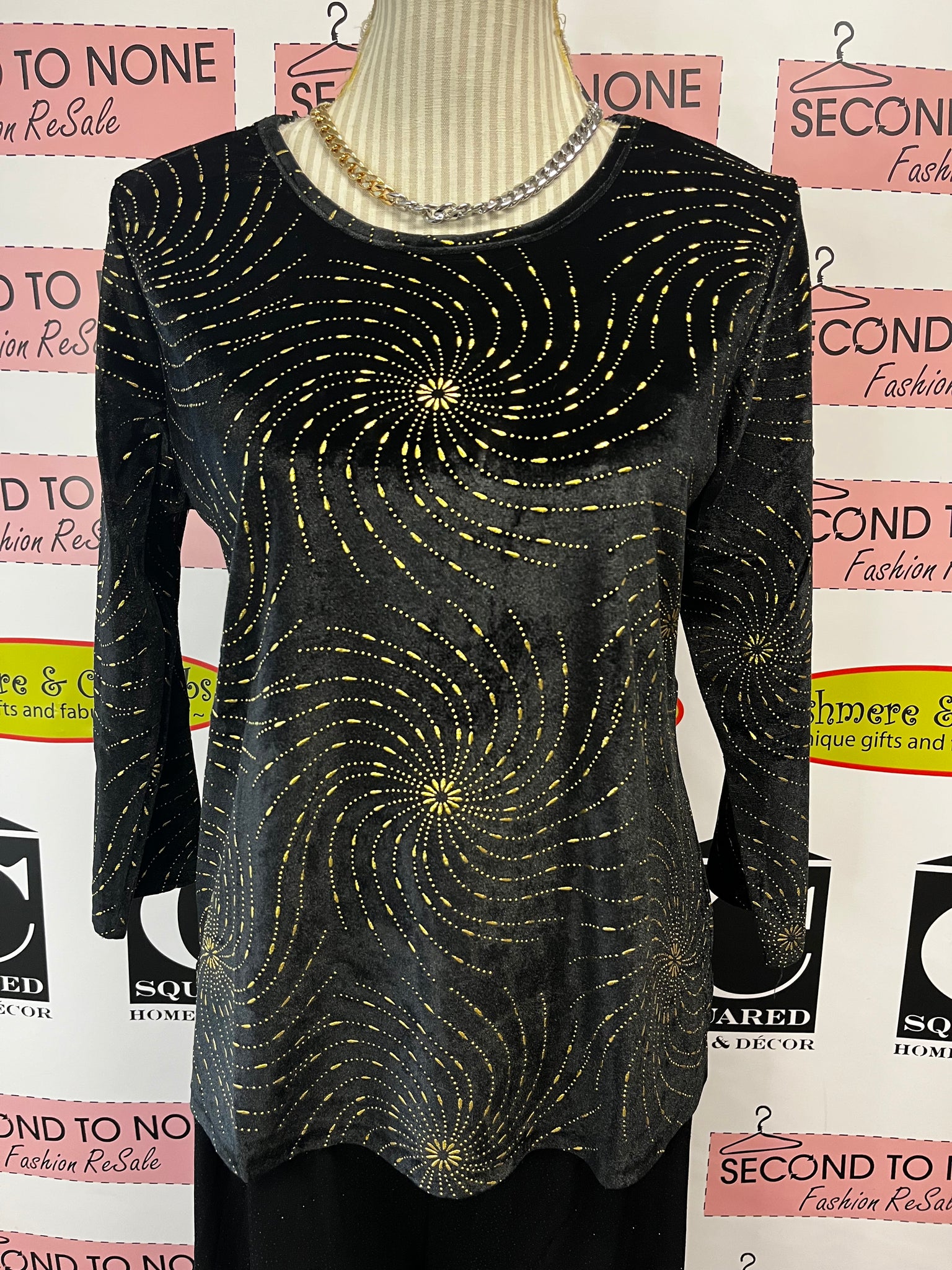 This Stretch Velvet Top dazzles with playful gold swirls and circles on both front and back. Side slits let it lay flat and move with you comfortably, perfect for dressing up or dressing down. Whether you’re headed on vacation or just want a fun, sparkly twist to your outfit, this top brings a lively vibe wherever you go! Fiori brand. 95% polyester/5% spandex.