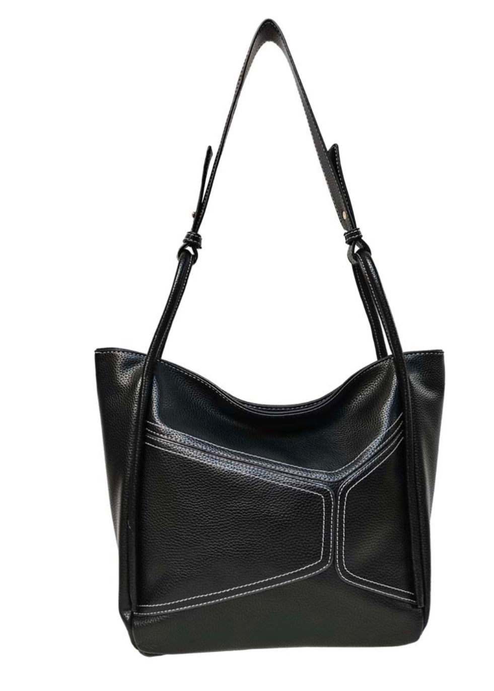 This Stylish Shoulder Bag adds a fun edge with its cool front details, white top stitching and a leather-like texture that's soft to the touch. Keep your essentials secure with a back zipper pocket and a top zipper closure. Plus, the adjustable straps make it easy to wear just the way you like. Available in two lively colors to match your mood! Measures 14"L x 5"W x 10"H (Handle = 11")