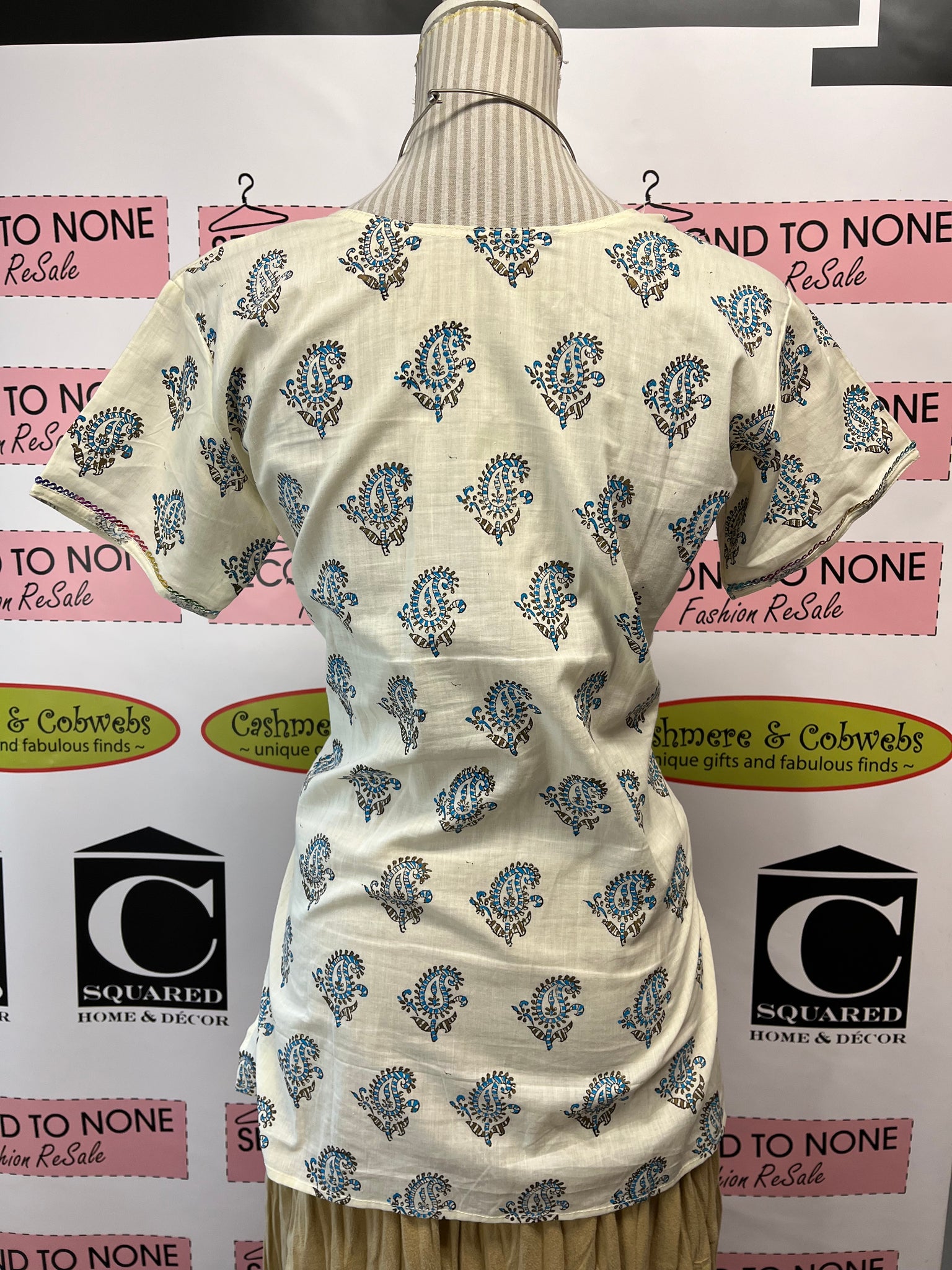 Get ready to sparkle and shine in this 100% cotton ivory t-shirt. With a fun and unique brown and teal all over print, you'll stand out from the crowd. The diamond square neckline is accentuated by beautiful sequins, which also adorn the sleeves and hem. Perfect for a casual day with added flair. (XS/S)