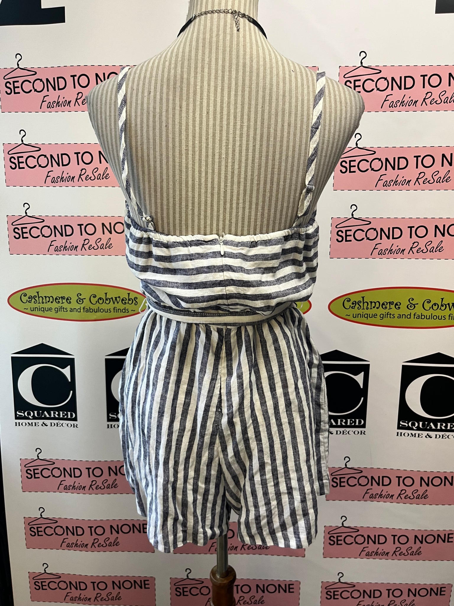 Embrace effortless summer charm with this 100% linen romper from C&C California. Featuring a playful white and blue alternating stripe pattern, it’s designed with an adjustable thin strap for a perfect fit and a belted waistline that flatters every silhouette. Light, breezy, and stylish, this romper is your go-to for sunny days and spontaneous adventures.