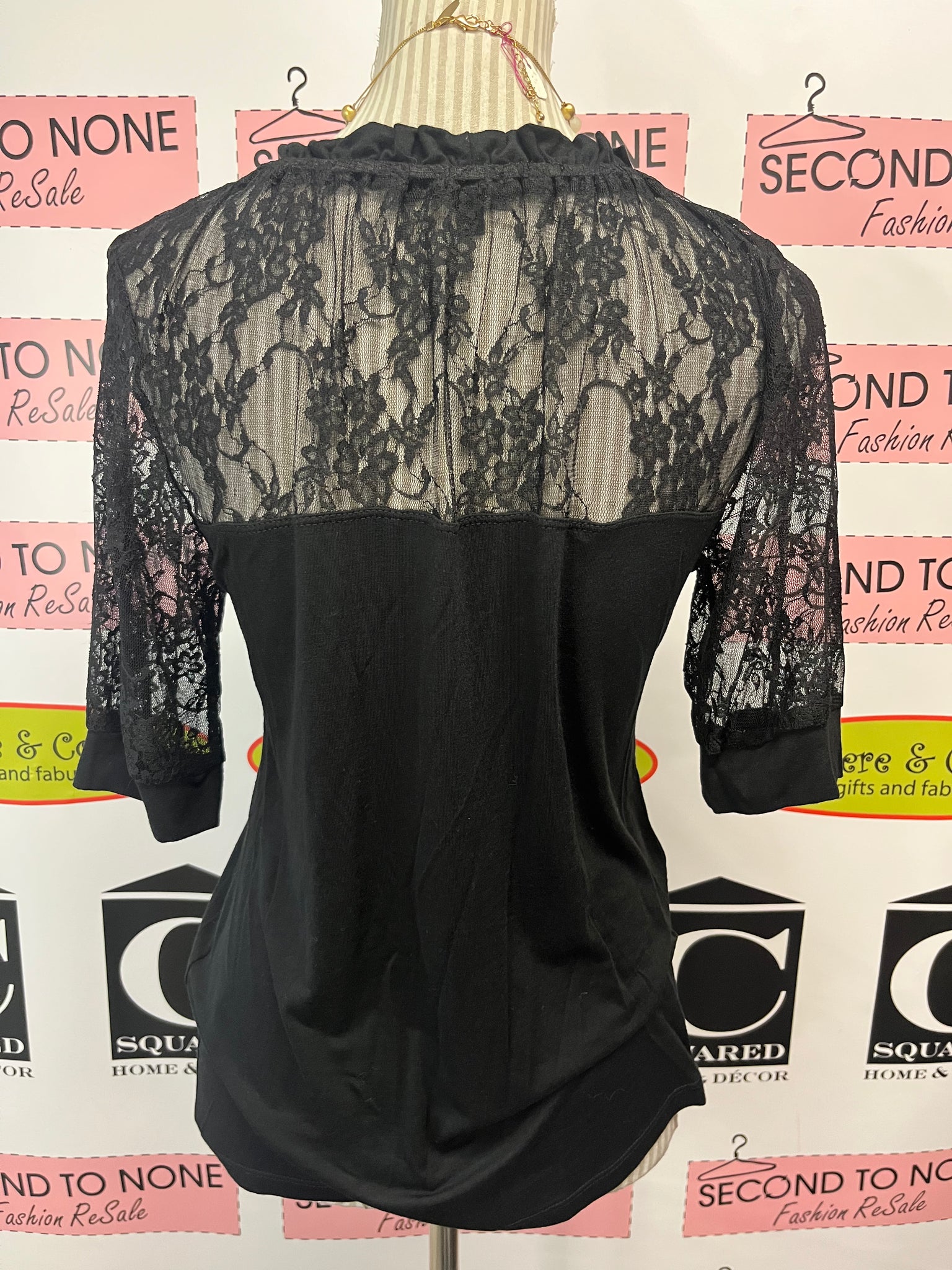 Elevate your wardrobe with our Black Half Lace T-Shirt. The high neckline with a frilly collar gives an elevated feel, while the sheer lace sweetheart neckline and fabric cuff on the short sleeves give unique touches of practicality and femininity. Made with soft and stretchy fabric, it's the perfect layering choice for colder months. Experience the luxury of an elevated basic. Brand: Storm Los Angeles. Size L.