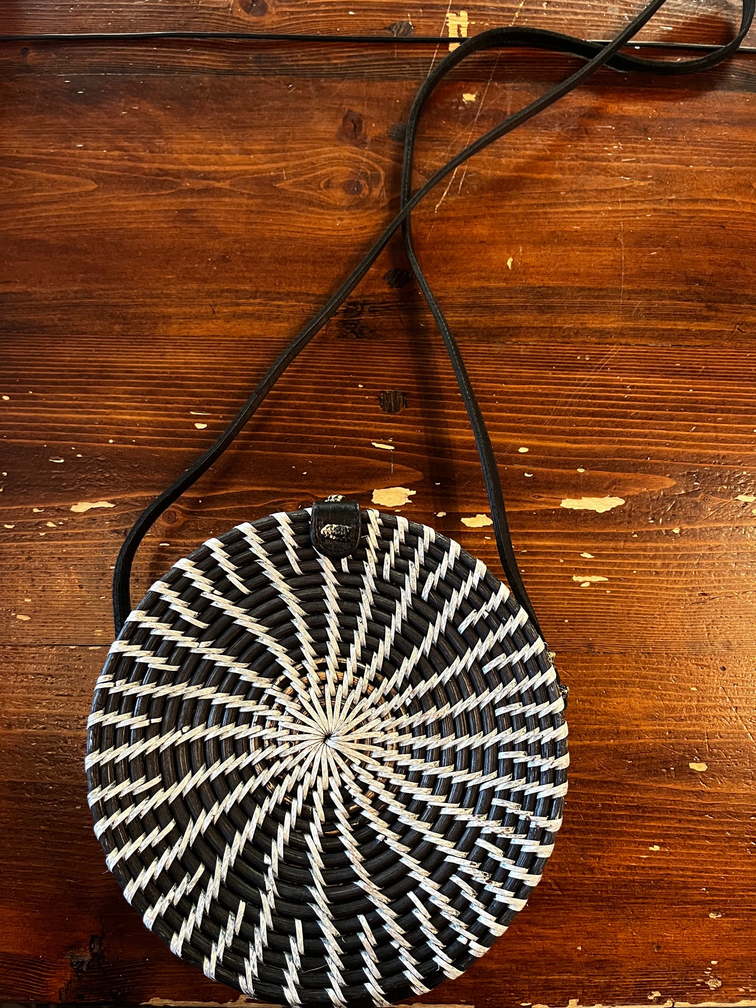 This playful Black & White Round Rattan Purse brings vintage charm with a modern twist. Its structured round shape and classic hinged opening make it as fun to use as it is stylish. Featuring a crossbody strap for hands-free convenience and a lined interior to keep your essentials safe, this purse adds a quirky flair to any outfit. Perfect for those who love a blend of retro vibes and practical design.
