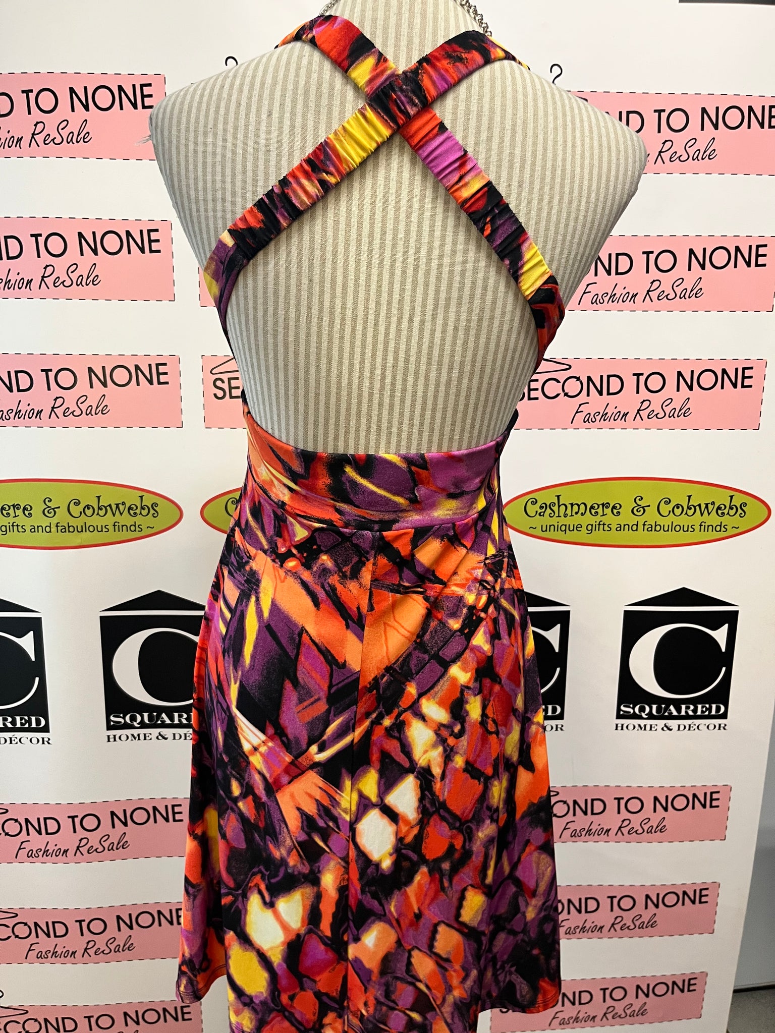 Turn heads in this Bold Print Sexy Cocktail Dress by Bisou Bisou. Featuring a vibrant, colorful pattern, a plunging v-neckline, and a flirty strappy criss-cross back, it’s made to dazzle from every angle. Perfect for party nights or special events, this size 4 dress blends playful charm with confident style.