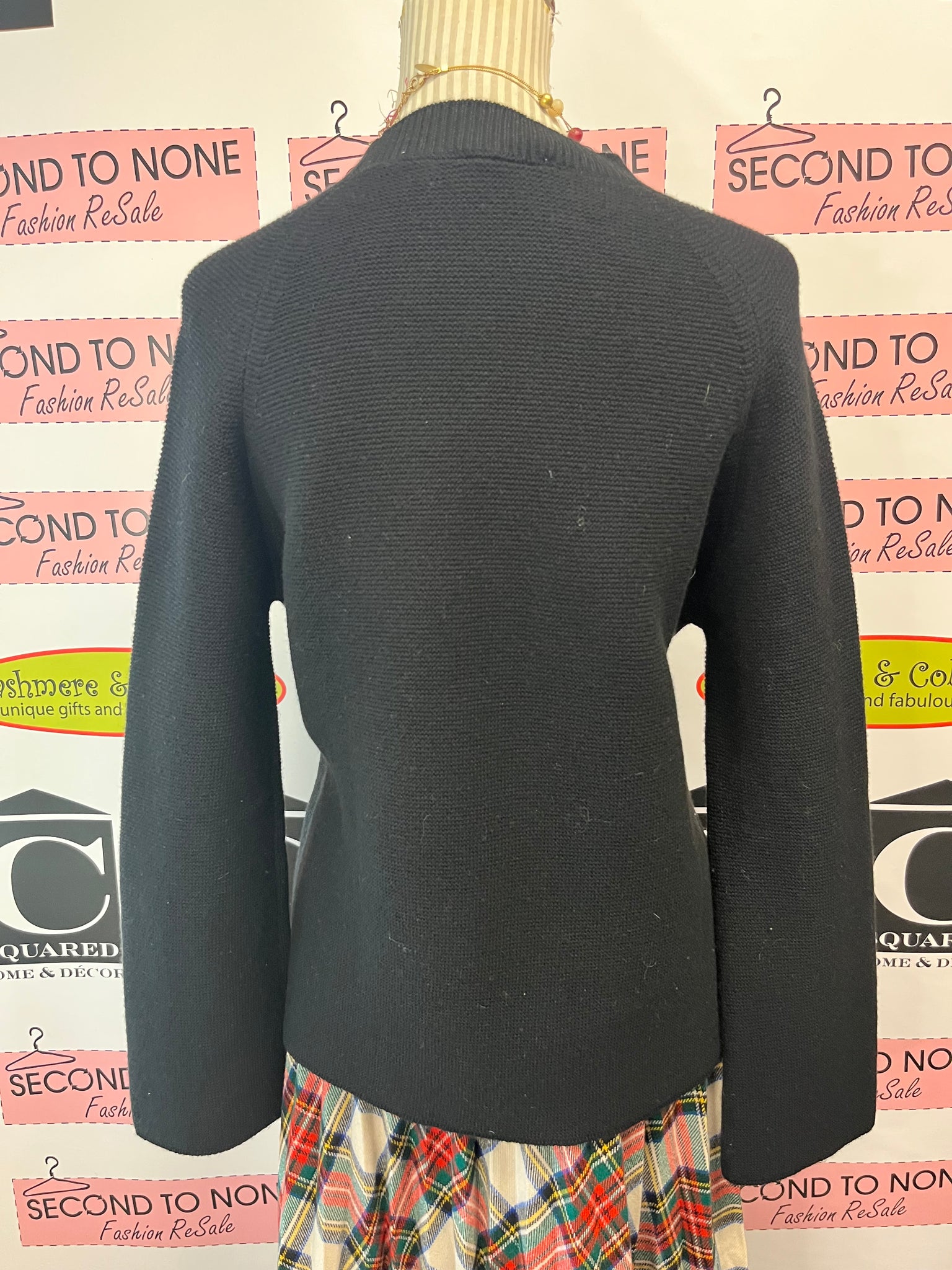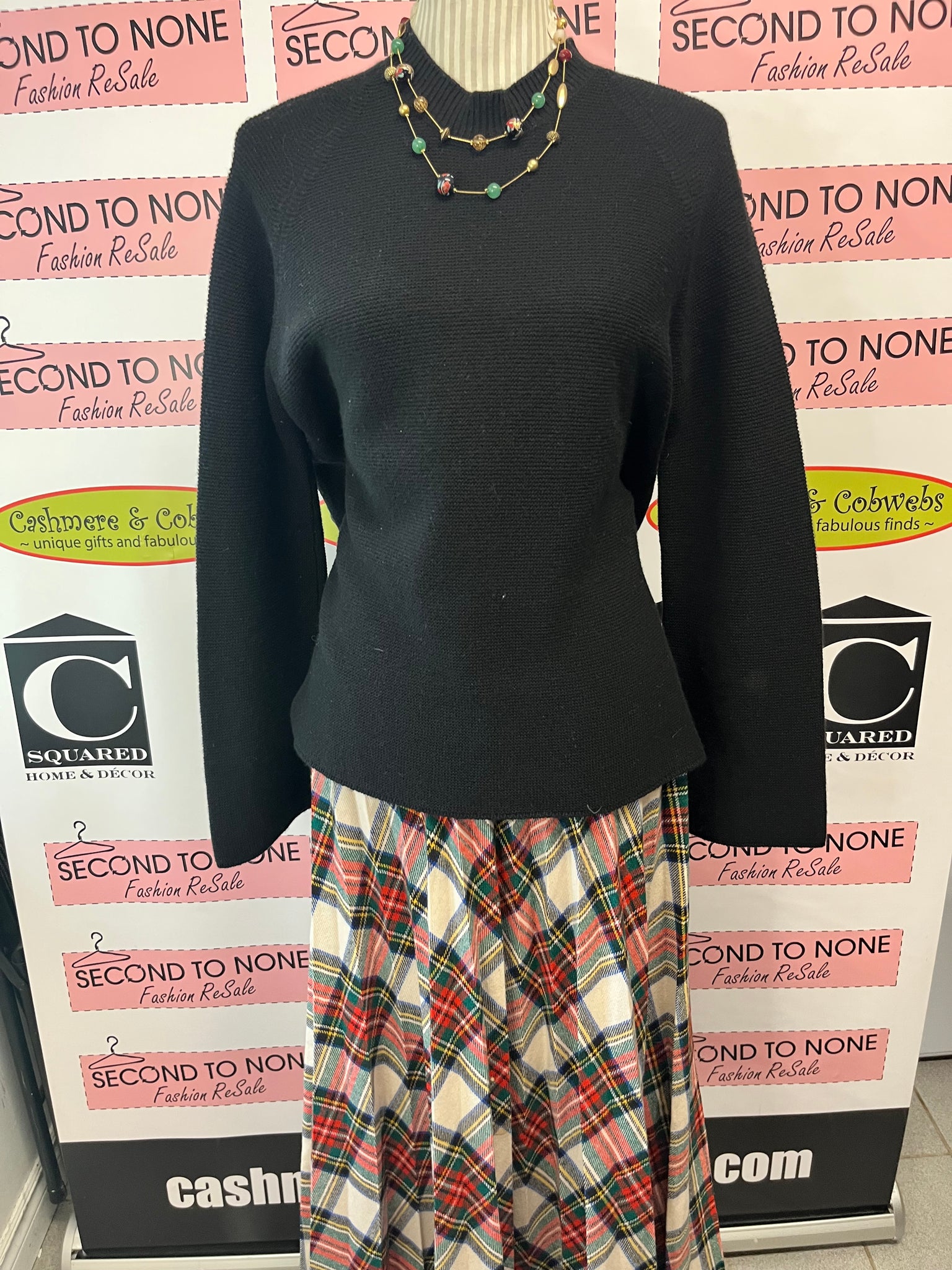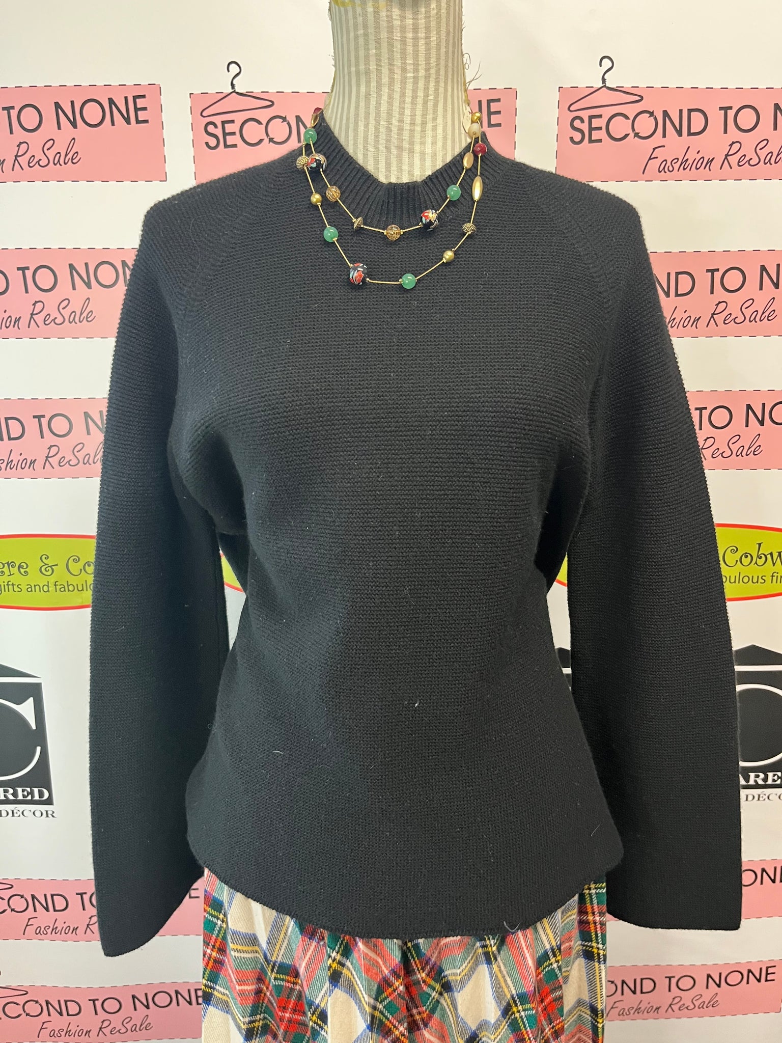 Slip into this classic black cashmere blend sweater, designed with long sleeves and a cozy higher neck to keep you snug all day. Its timeless style goes with absolutely everything, making it your go-to for effortless cool and comfort. Perfect for layering or wearing solo, this sweater adds a playful touch of warmth to every outfit. Base brand. Milano. 90% wool/10% Cashmere.