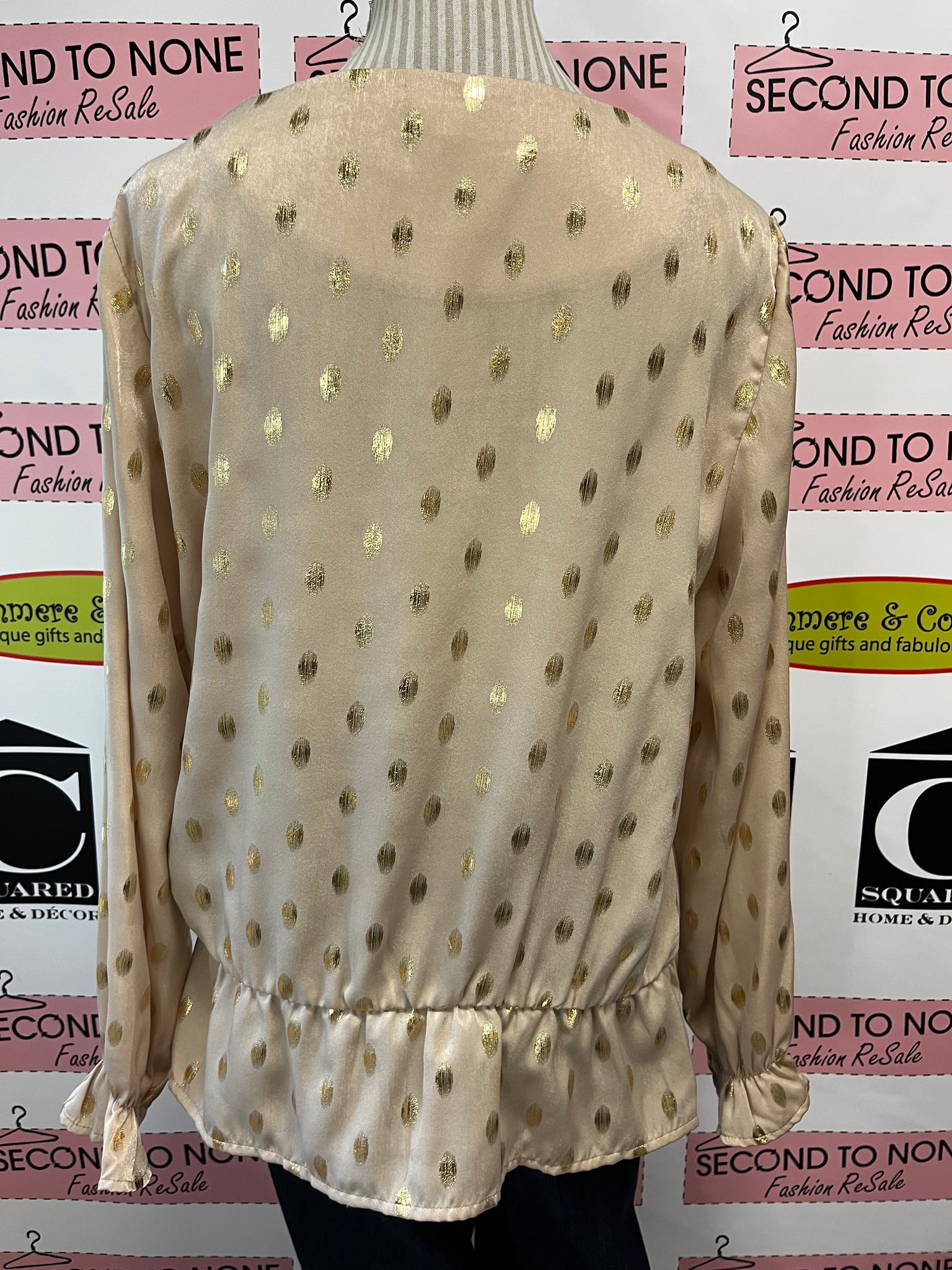 This playful blouse from Fransa features a beige, satin-like fabric adorned with shimmering gold polka dots that catch the light with every move. Its long sleeves add a touch of elegance, making it perfect for both casual days and dressy evenings. Embrace effortless charm and a hint of sparkle with this pretty, standout piece.