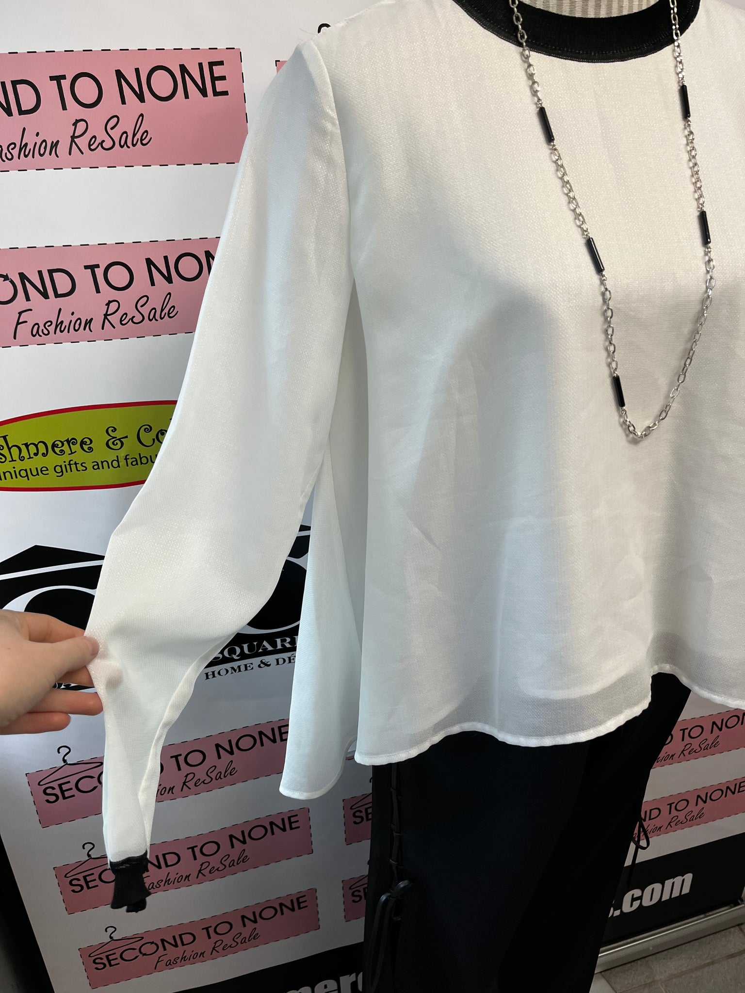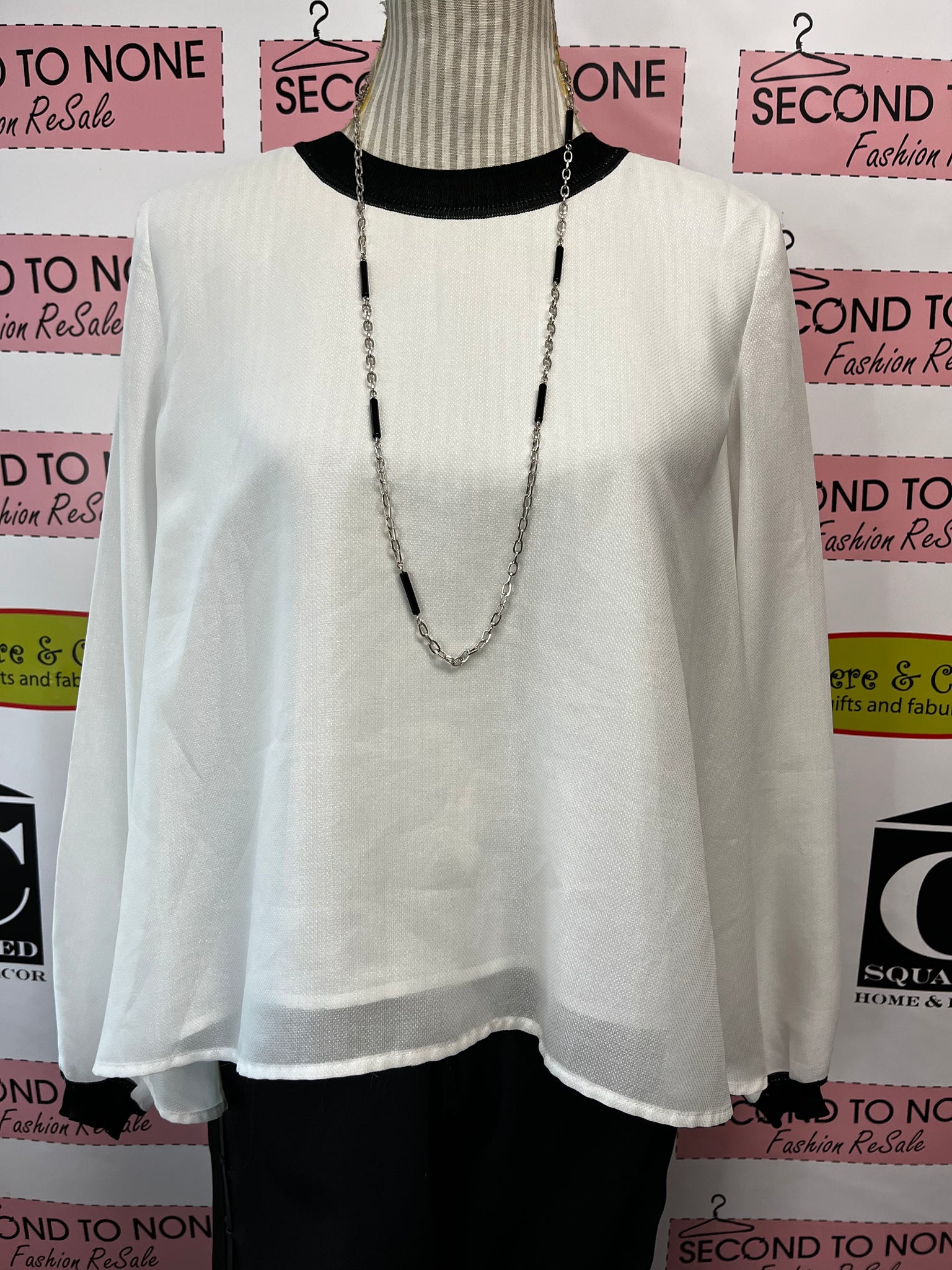 This French Connection blouse brings a breezy charm with its lightweight, flowy fabric and relaxed fit. The crisp white body contrasts playfully with bold black neckline and wrist accents, creating an effortlessly chic layered look. A high neckline adds a touch of sophistication, making it perfect for days when you want comfort without sacrificing style.