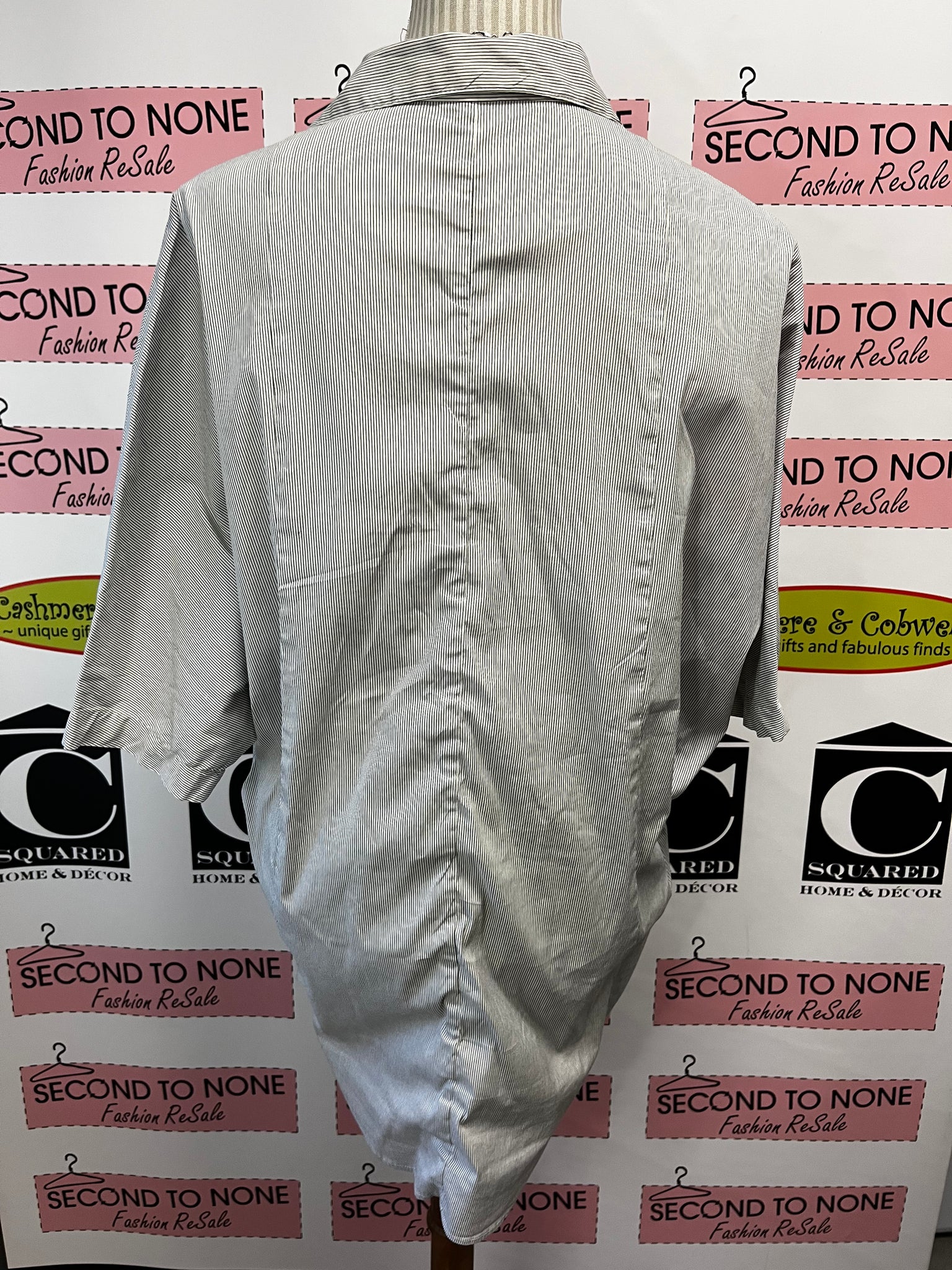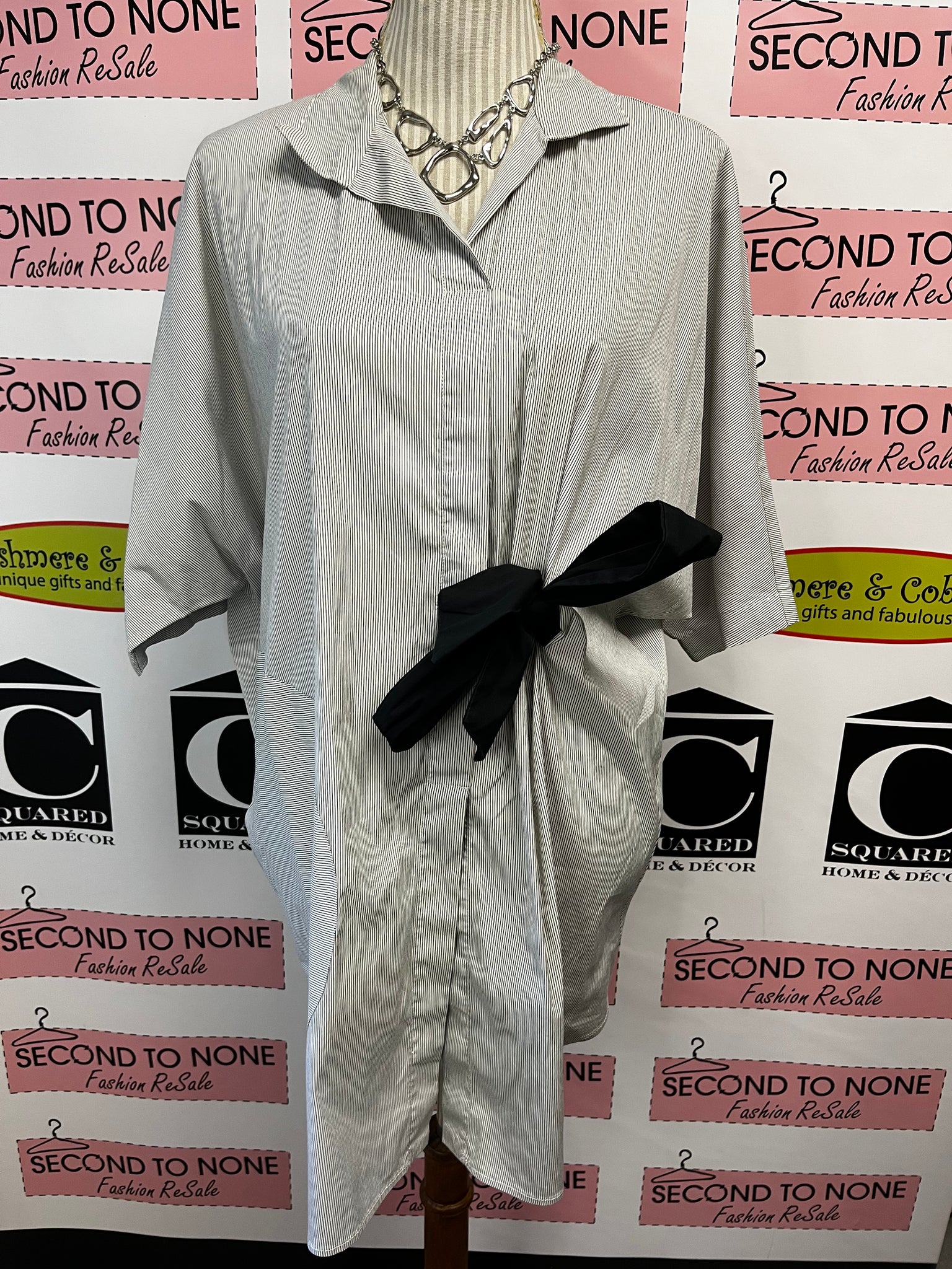 Experience sophistication and playfulness in one with our Front Bow Striped Tunic. Featuring thin black stripes and an oversized black tie bow that is slightly off-centred, this tunic's asymmetrical design adds a touch of elegance. With one large pocket and a length that drapes past the bum, it's the perfect addition to any stylish wardrobe. Size S. Brand: Periphery.