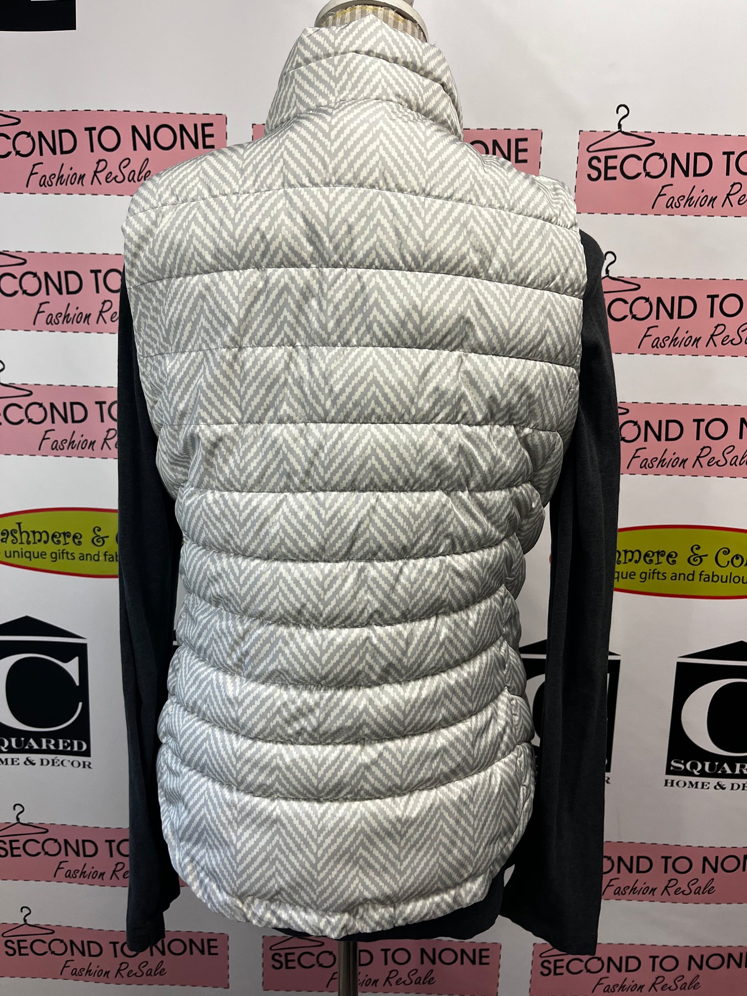 This GAP puffer vest in a charming light grey and white pattern is your perfect fall sidekick. Its cozy puffed design and zip-up front keep you snug while adding a stylish twist to your outfit. Whether you’re chasing leaves or sipping pumpkin spice, this vest layers effortlessly for warmth and weekend fun.