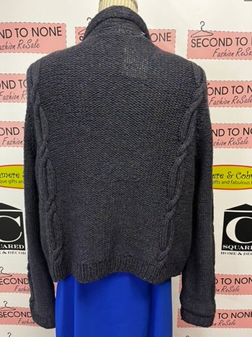 As the colder months approach, step into fall with this charming Handmade Chunky Knit Sweater (Size L). The chunky, slightly open knit texture not only provides warmth, but is perfect for layering and will complement any outfit. With a classic v-neck design and glossy plum and black buttons, this sweater is timeless and charming. Crafted with care and attention to details, the blue and purple fabric with speckles of light brown woven in and subtle cable detailing make this sweater a cozy and versatile choice for the season. Fits L.