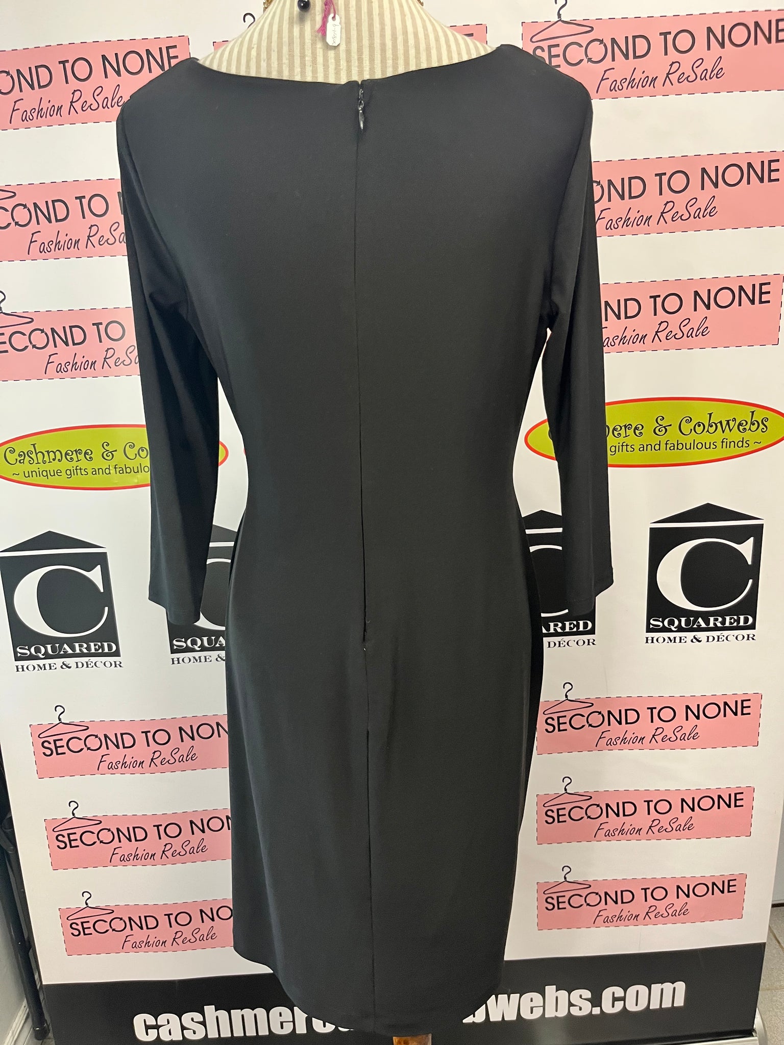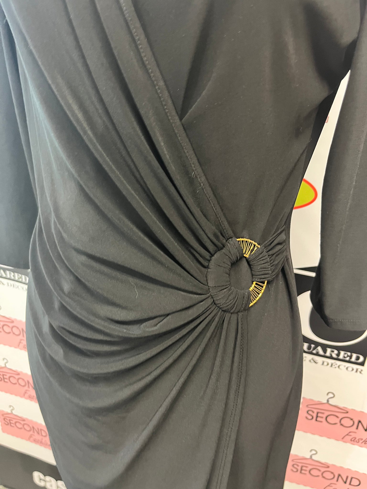 This playful mock-wrap dress features 3/4 sleeves and a gold circle accent that adds a touch of sparkle. Made from stretchy silky fabric, it moves with you for all-day comfort. A back zipper ensures easy on and off, making it your go-to for effortless style. 95% polyester/5% spandex