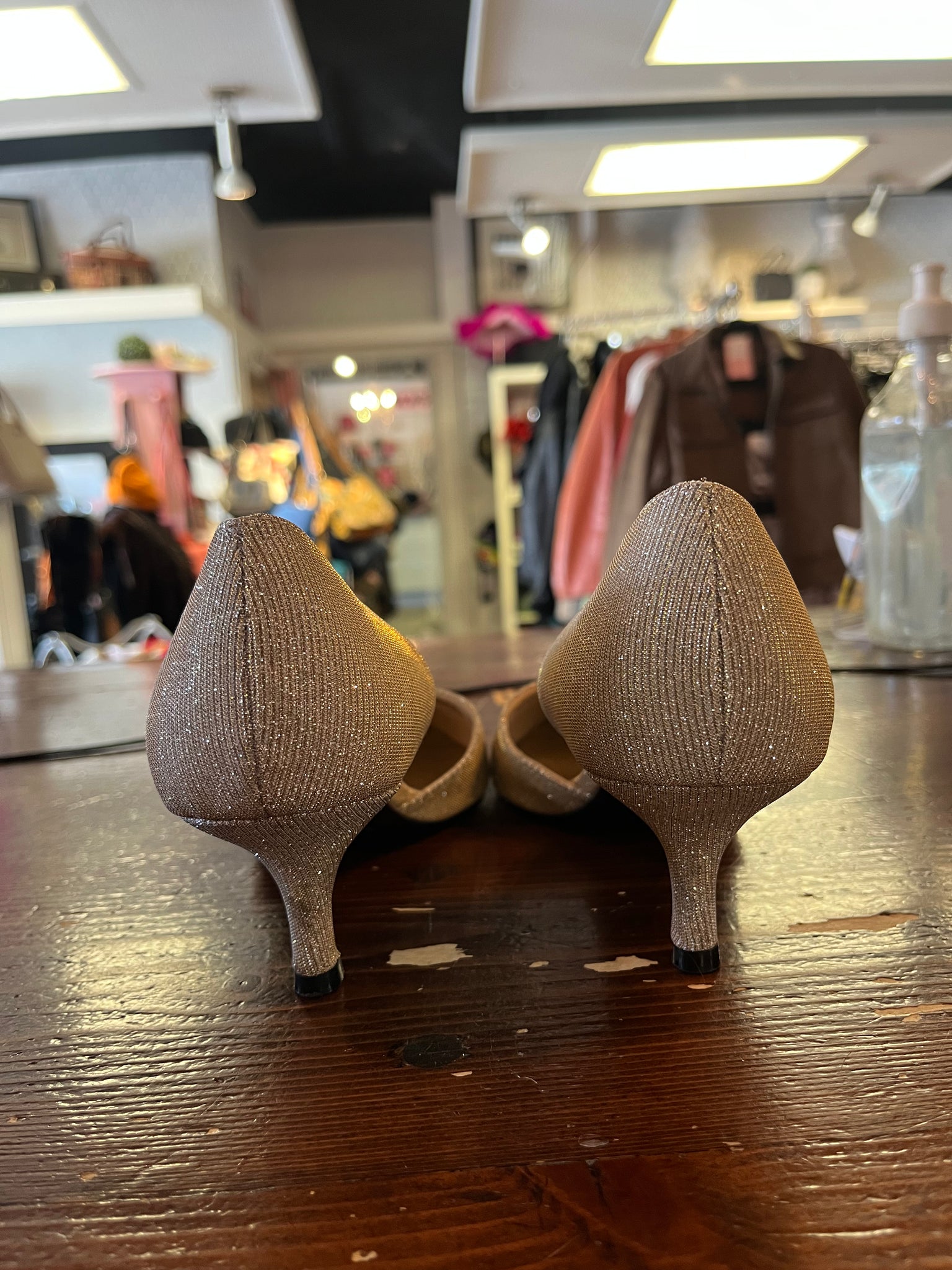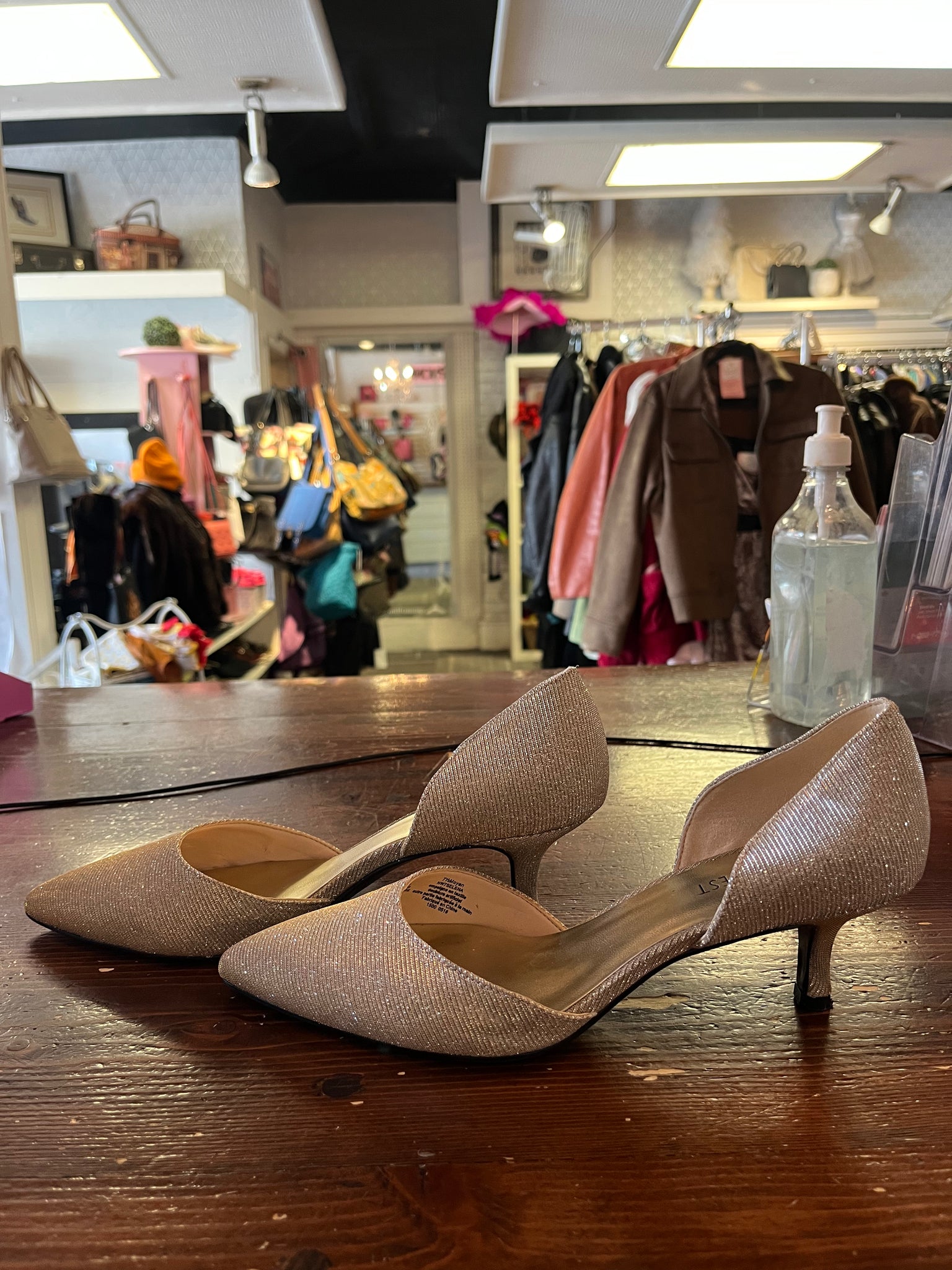 Step out in style with these Nine West Gold Sparkly Heels! These glitzy and glamorous shoes feature a pointed toe and a 2 inch stiletto heel, making them the perfect choice for any evening event. The D’orsay style will show the side and arch of your foot adding a touch of elegance, while the glitter adds a playful and unique touch. With their excellent condition, these heels are sure to become your go-to for any occasion. (Size 7.5)
