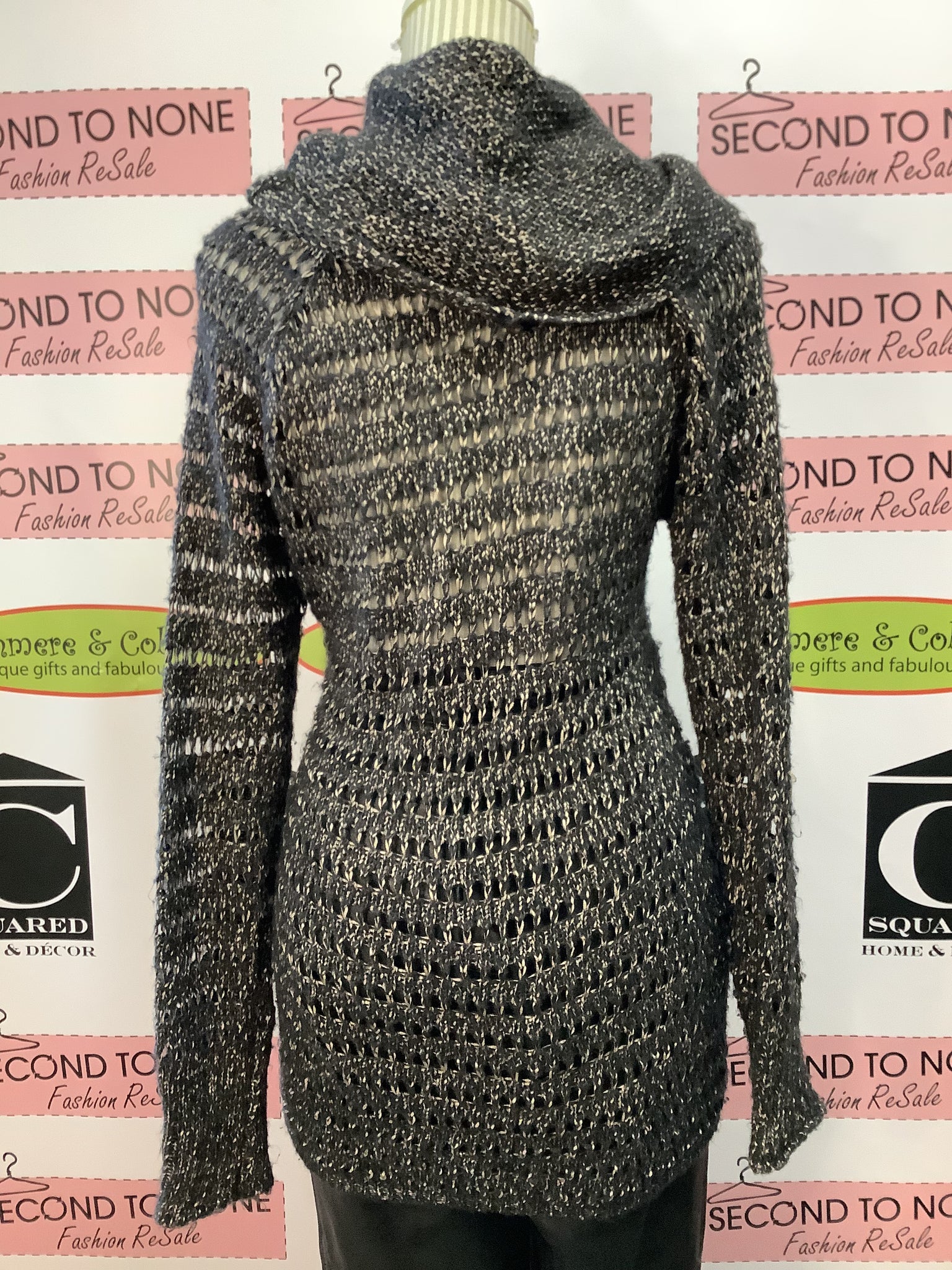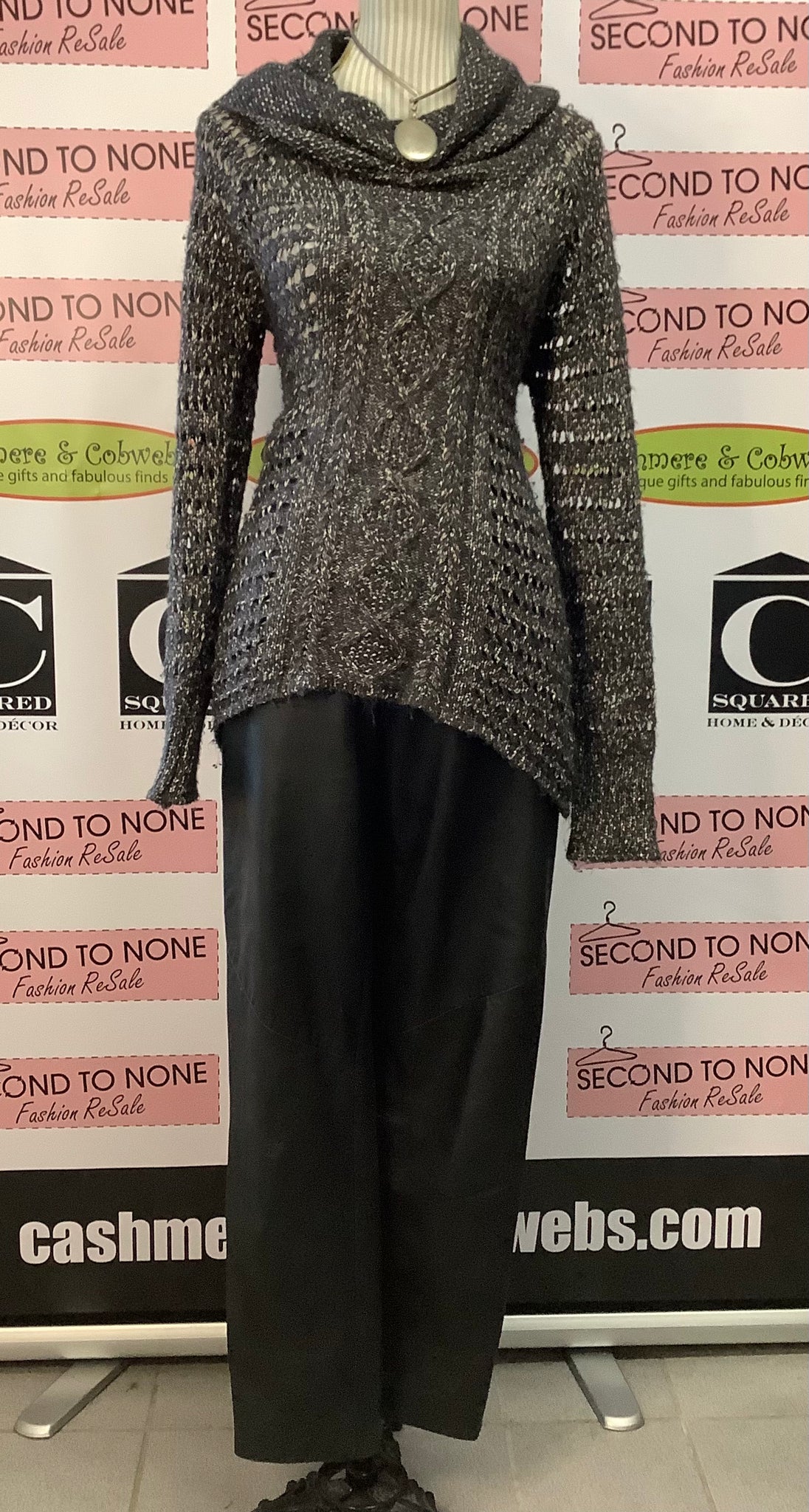 This cozy sweater would be amazing over a plain white tank or long sleeve top. Check out the gorgeous cowl neckline and the beautiful knit style, slightly longer at the back. Pair with tights or leather pants for the most dramatic look. Appears to be a Polyester, Cotton blend.