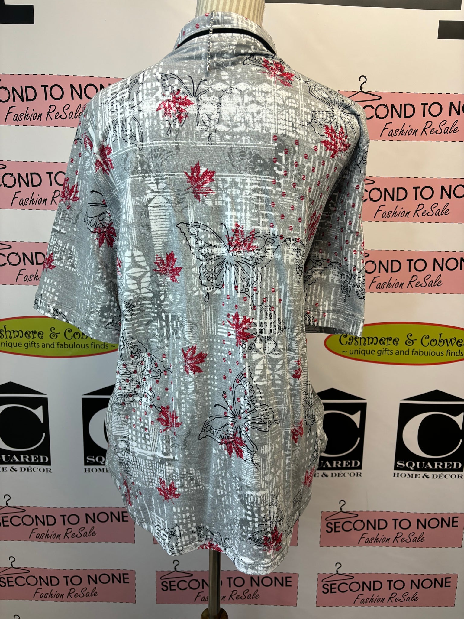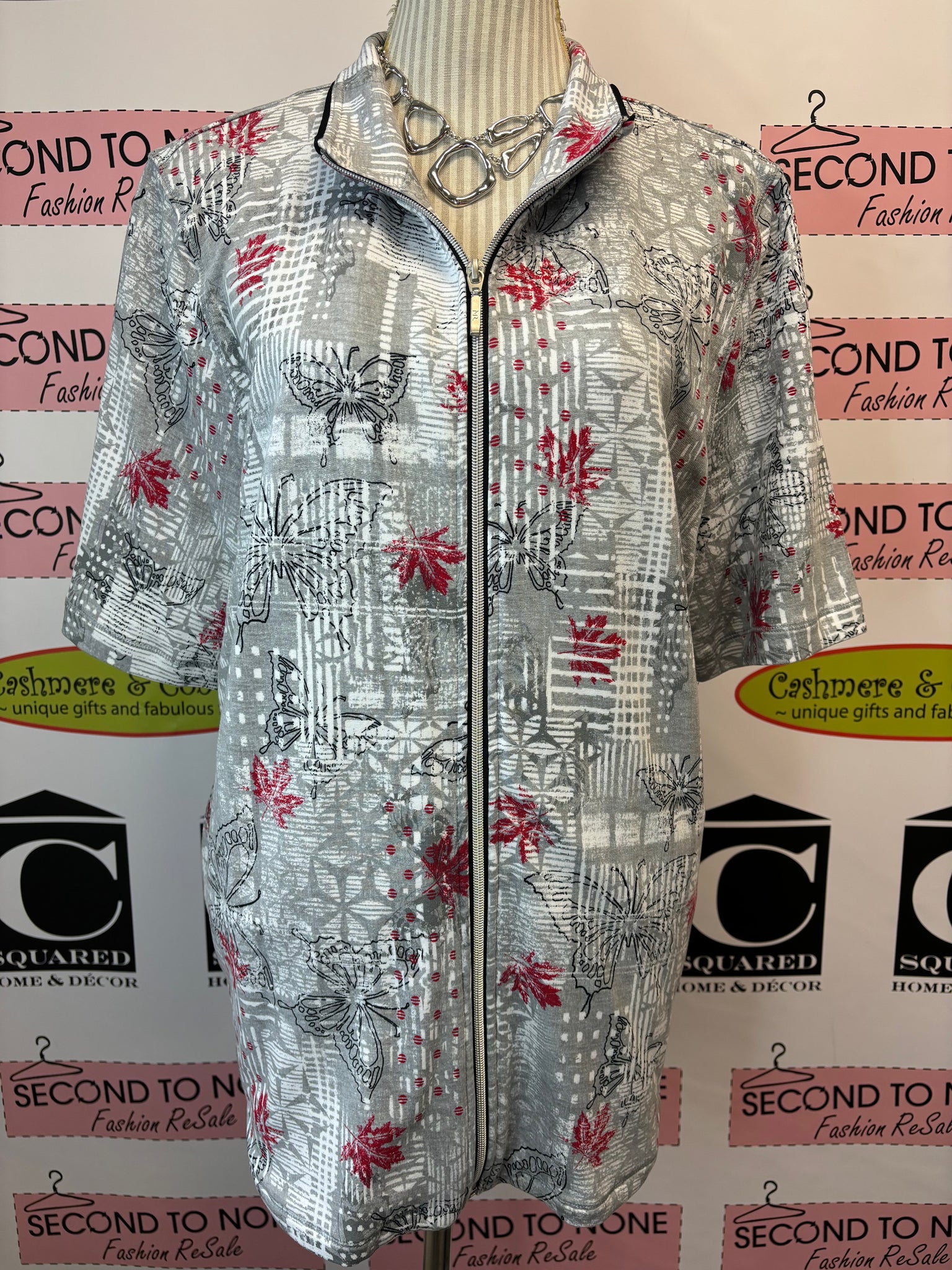 This stylish top features a black butterfly print, red contrasting patterns, and grey and white abstract artistic patterning. The full length silver zipper and thick material offer both style and functionality. Wear it open or closed, and layer it with a basic colored camisole or t-shirt. Perfect for pairing with bootcut or straight leg jeans for a cute and versatile look.