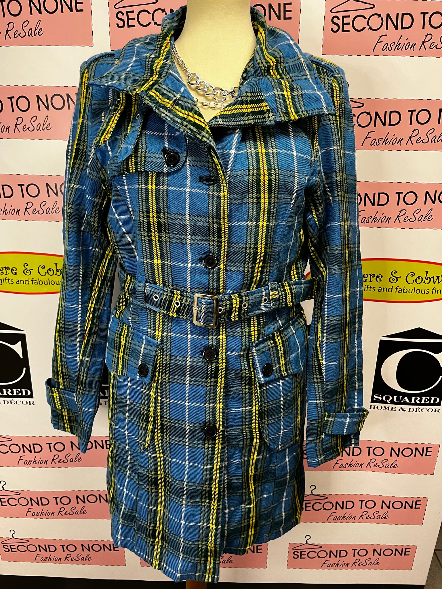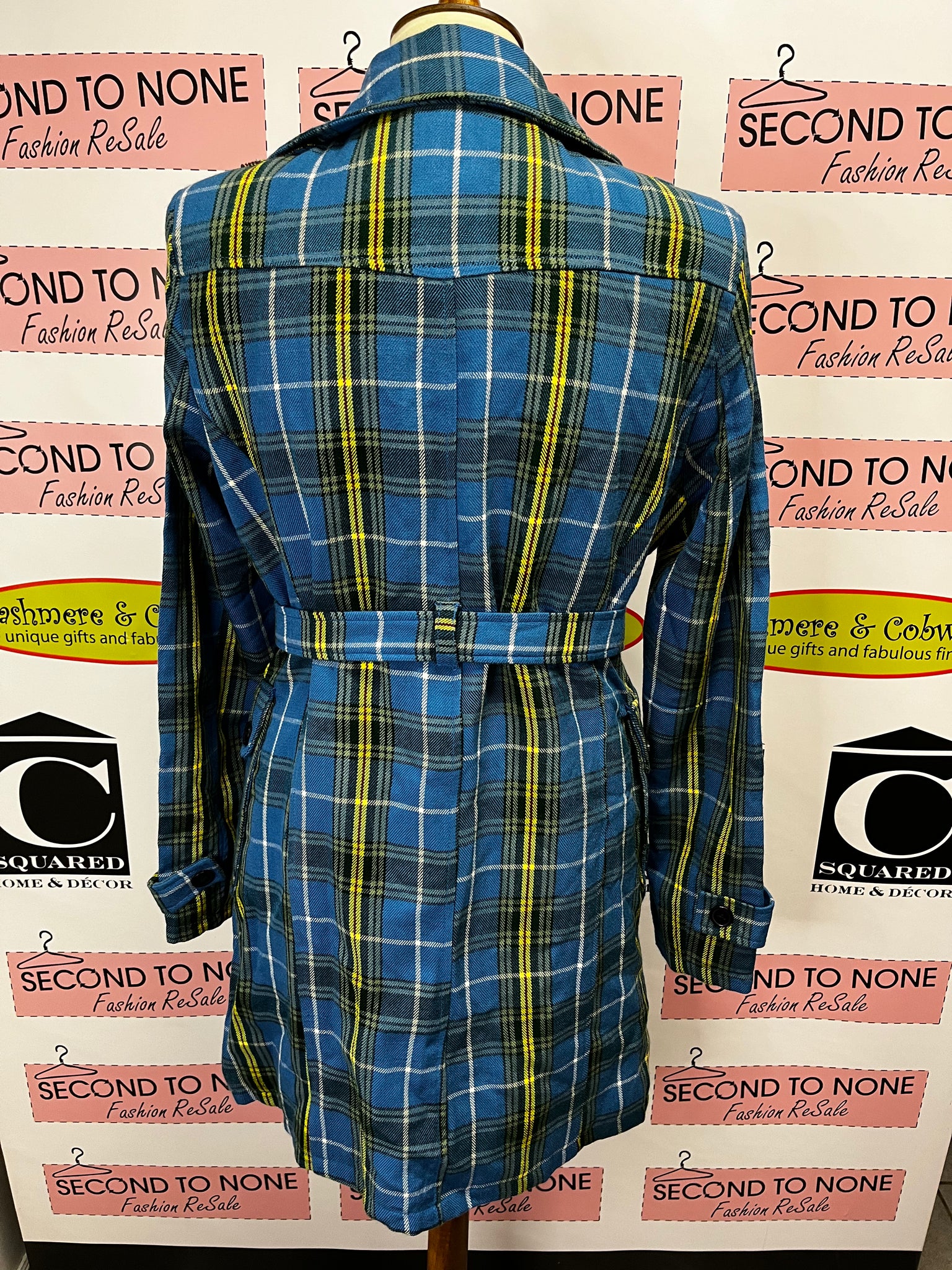 Wrap yourself in style with the Nova Scotia Tartan Trench Coat! This unique coat features the registered Scottish tartan of Nova Scotia, perfect for the fashion-forward individual. The trench coat style, button up front, and belt add a touch of sophistication, while the option to wear it open like a suit jacket adds versatility to your wardrobe. Stay warm and stand out in this Patrick King Woolen Co. piece.