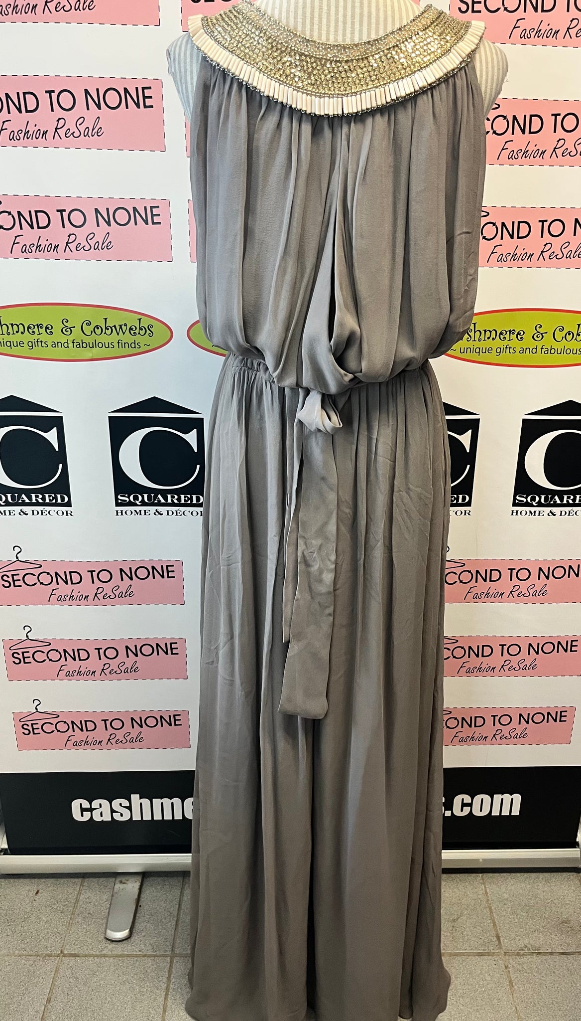 Step into the spotlight with this stunning evening gown by Adolfo Dominguez. In a chic grey-brown hue, it boasts a beautifully beaded neckline that adds just the right amount of sparkle. Brand new with tags, this size 42 (L) dress originally priced at €468 offers a glamorous look that's ready to wow at your next event. Feel fabulous and effortlessly elegant in a gown designed to turn heads!