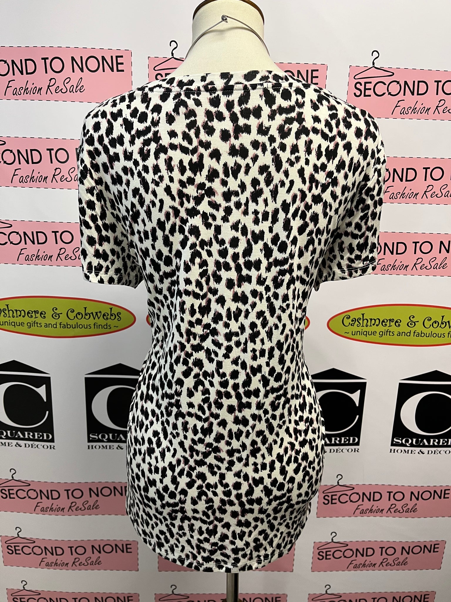 Unleash your wild side with this NWT Animal Print T-Shirt in size L! Featuring a bold black, white, and purple animal print design, this t-shirt from Maurices is sure to turn heads. And with the tags still on, it's brand new and ready to add some fierce style to your wardrobe. Don't miss out on this must-have statement piece!