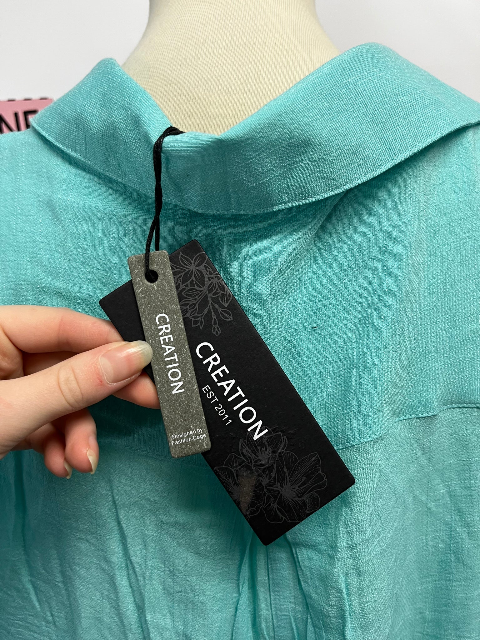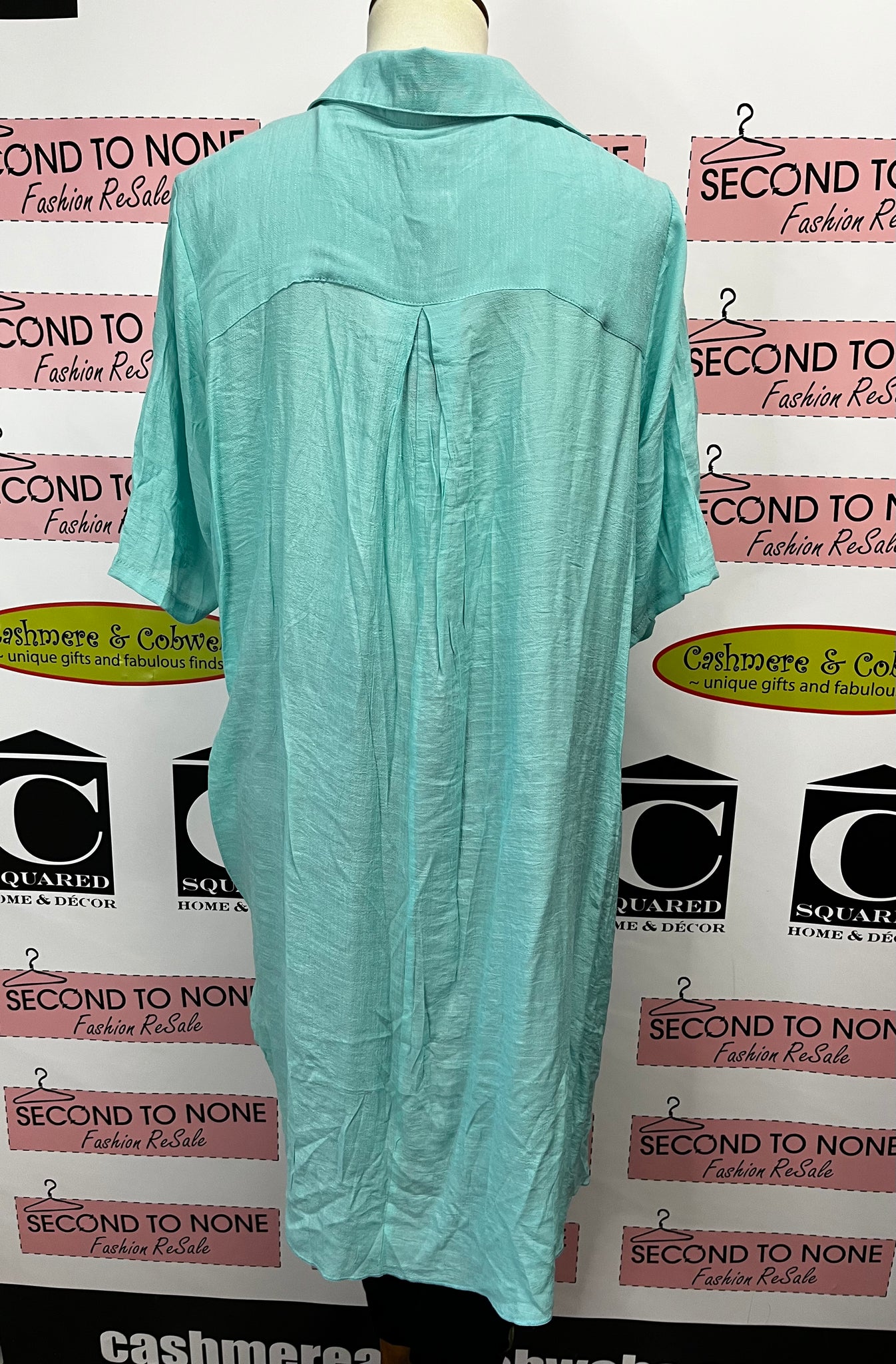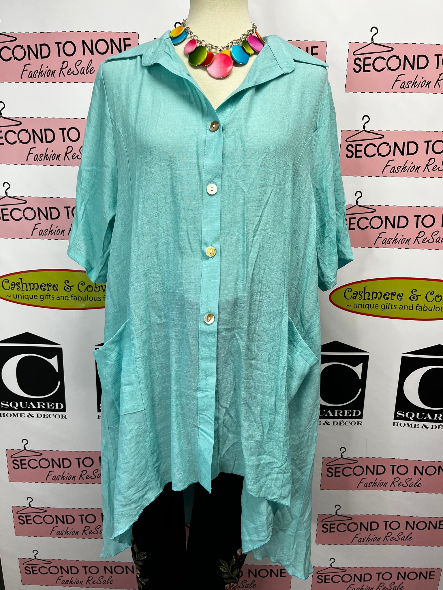 Step into summer with this NWT Aqua Hi-Lo Tunic by Creation. In a bold and bright aqua color, this collared button-up top features flowy and relaxed fit with a trendy hi-lo bottom and 3/4 sleeves. Never worn with tags still attached, this tunic is ready to make a splash in your wardrobe.