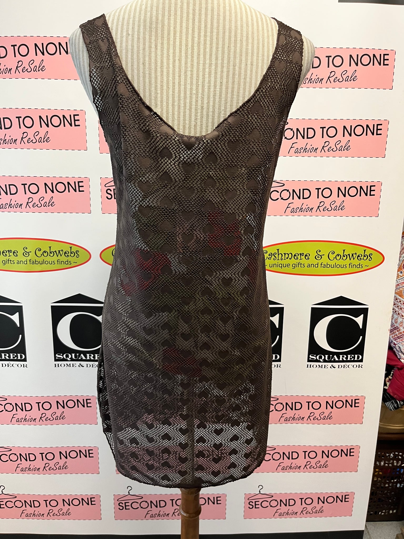 This charming brown mesh cover-up features a playful open knit heart design and a flattering longer tunic length. Perfect for layering, wear it as a breezy top or effortlessly throw it over your bathing suit for a stylish beach or poolside look. New with tags, it’s ready to add a fun, flirty touch to your summer wardrobe. DKR brand.