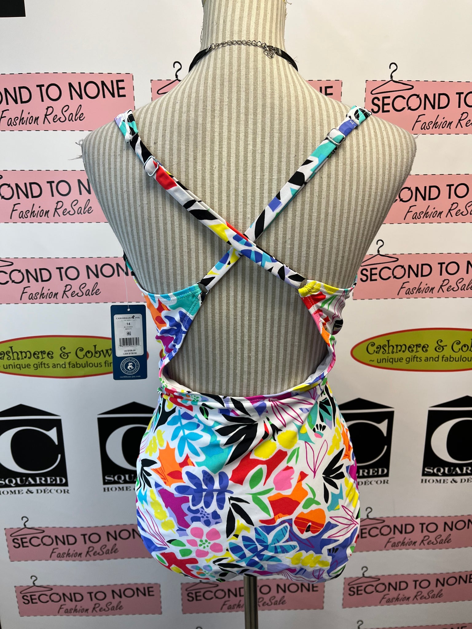 Dive into vibrant fun with this Caribbean Joe one-piece swimsuit! Featuring a playful multi-colour design, adjustable crisscross back straps, and a flattering draped front, it’s perfect for making a splash in style and comfort. Ideal for size 14, this suit combines eye-catching colors with a comfortable fit for your beach or pool adventures. Retailed new for $138!