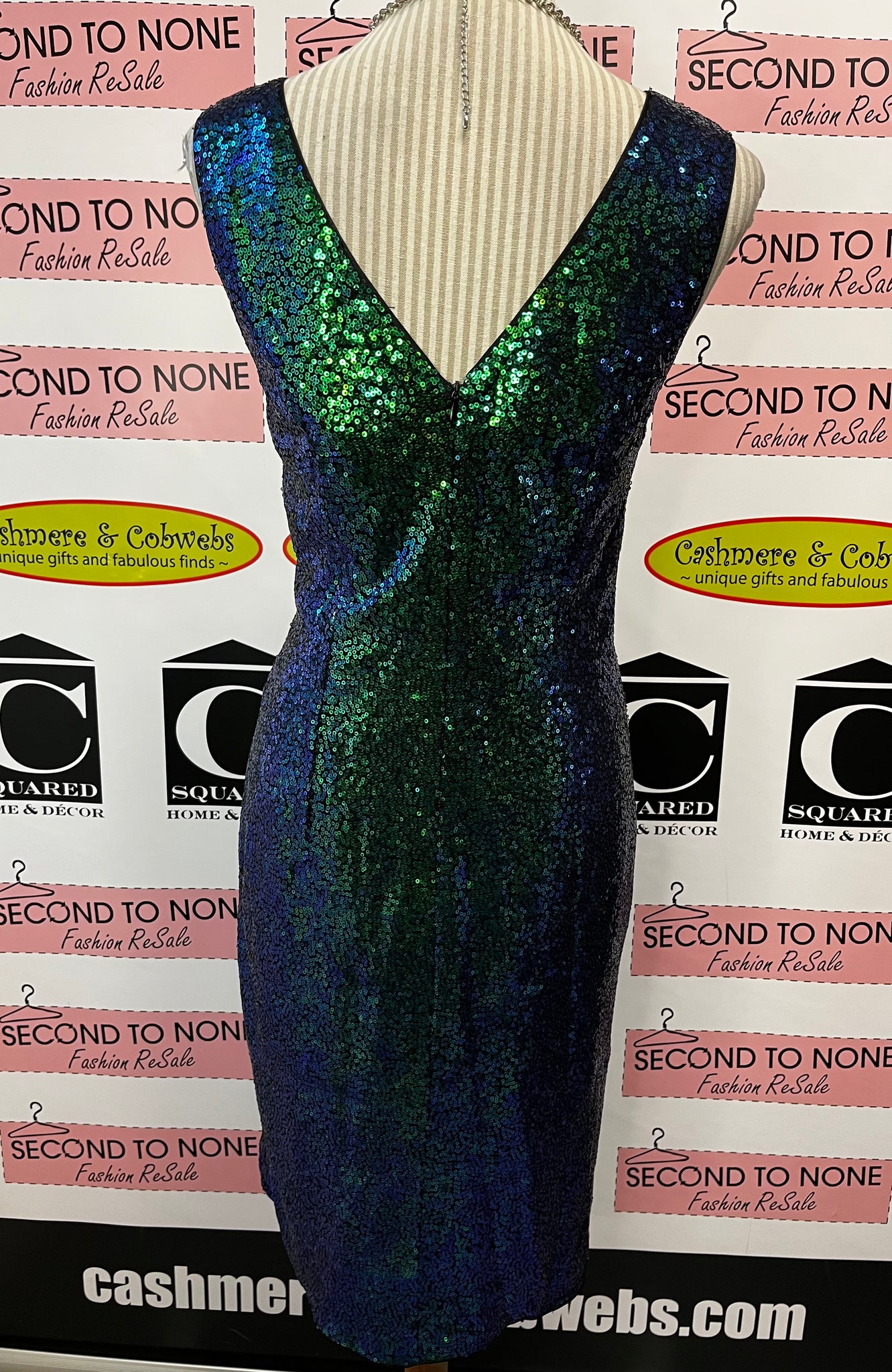 Turn heads in this playful sleeveless sequin dress by Grace Karin. Covered in shimmering blue and green sequins, it catches the light with every move. New with tags and designed to flatter, this sparkly dress adds a fun, glamorous touch to any occasion. Perfect for dancing the night away or making a dazzling statement!