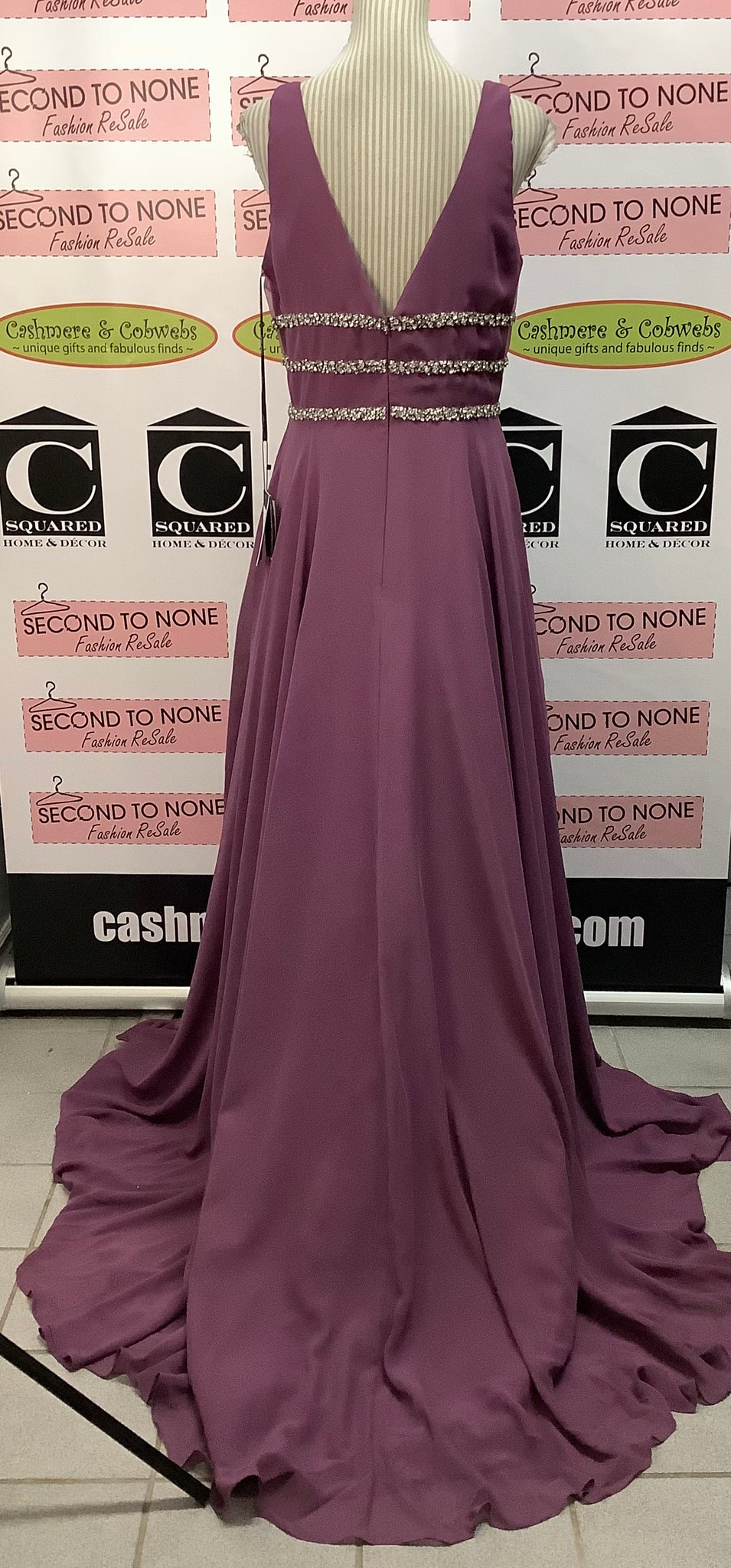 Indulge in the luxury and elegance of our NWT J’Adore Deep V-Neck Evening Gown. This stunning purple gown features a full length with a train, sleeveless design and deep v-neckline. Adorned with sparkling rhinestones, it is the perfect choice for any special occasion. The zipper closure at the back and sheer overlay add a touch of sophistication, while the lining ensures a perfect fit. Elevate your style with this exquisite gown.