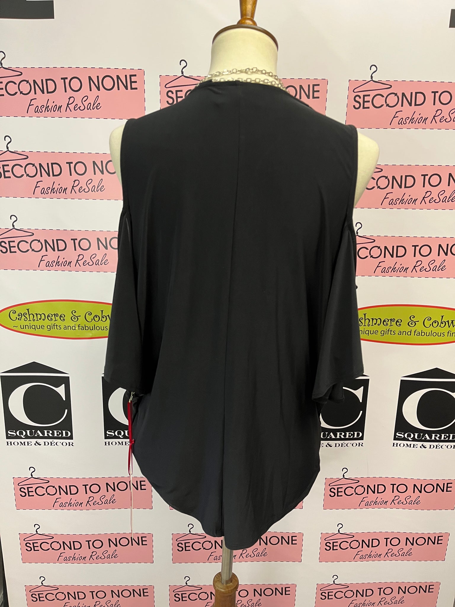 This black, drapey, cold shoulder blouse from Jennifer Lopez comes with a built-in necklace feature, adding a touch of elegance. It's brand new with tags and originally retails for $40USD. Make a statement and elevate your wardrobe with this stylish top!