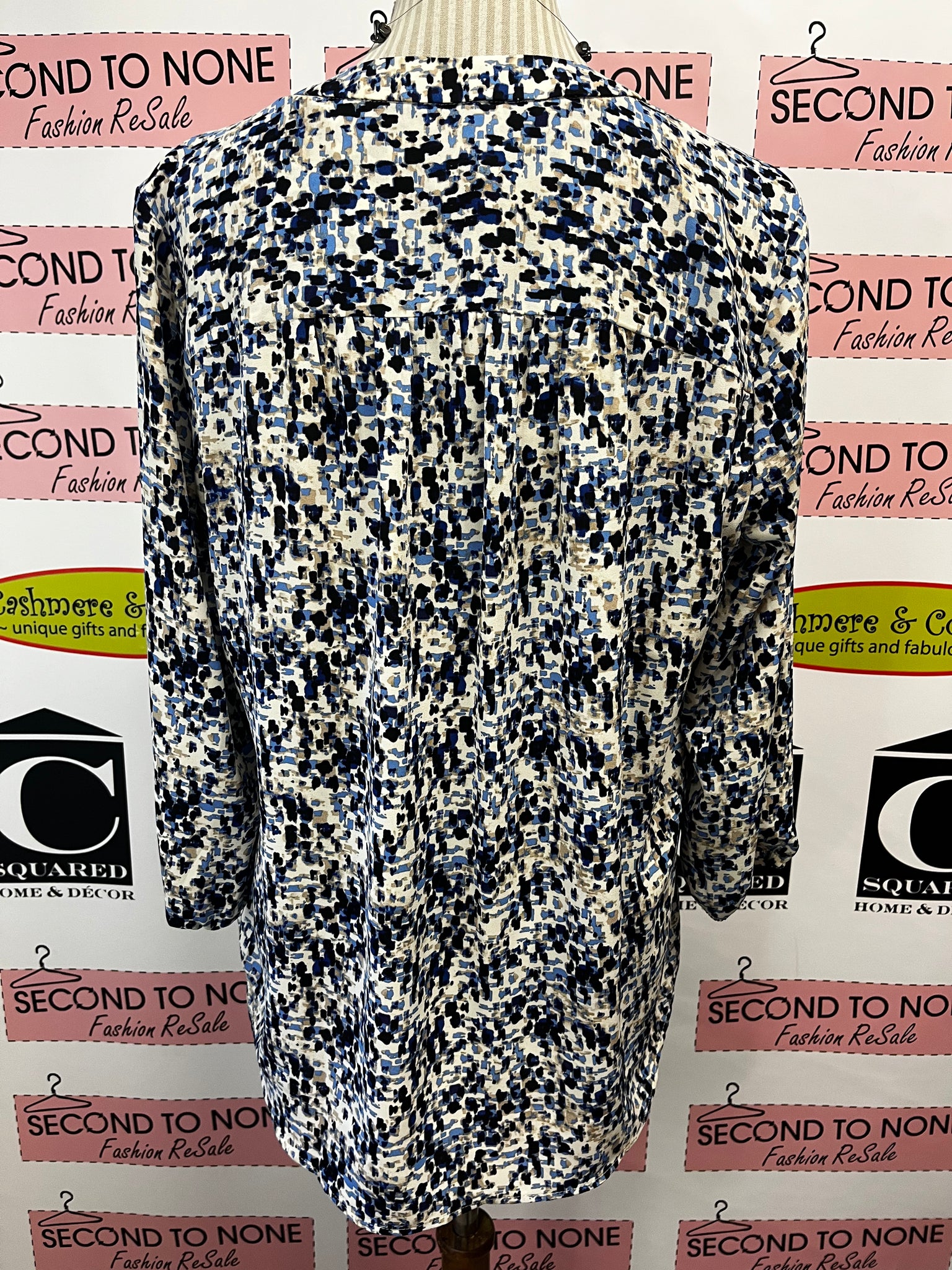 Add a splash of fun to your wardrobe with this brand-new Jones New York tunic top! Featuring a vibrant print in blue, black, white, and brown, this size M piece comes with original tags and promises comfortable style with a playful twist. Perfect for turning heads and brightening any day!