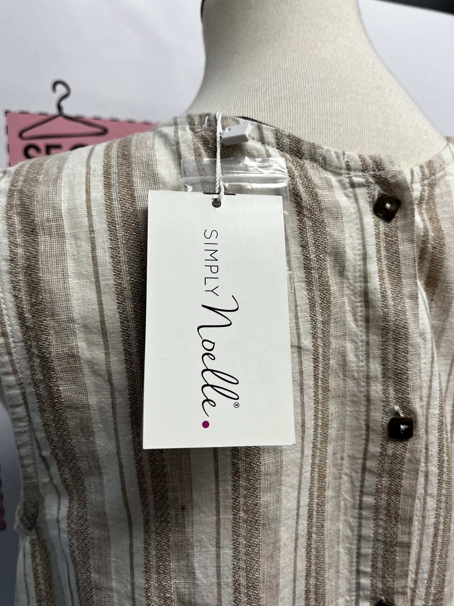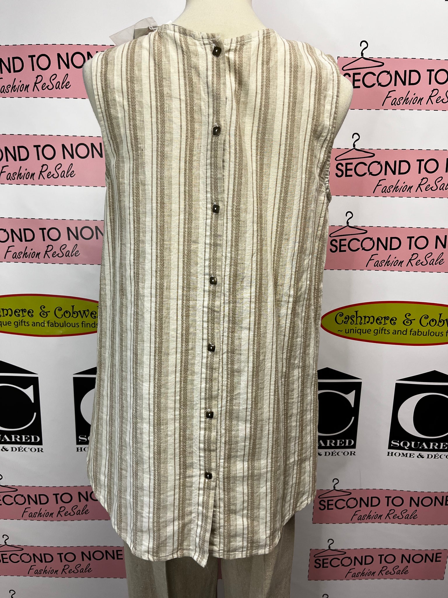 Step into summer with the NWT Linen Blend Tunic by Simply Noelle! This beige and cream striped tank top features a relaxed fit and tunic length, perfect for breezy days. Wide straps and a button-down back add a playful touch to this must-have piece. Not to mention it's new with tags!