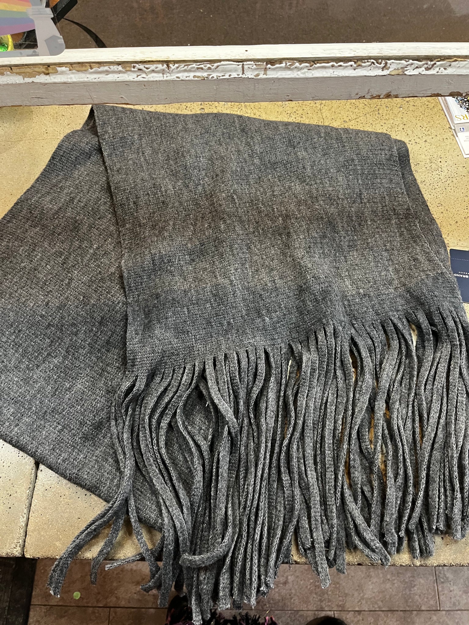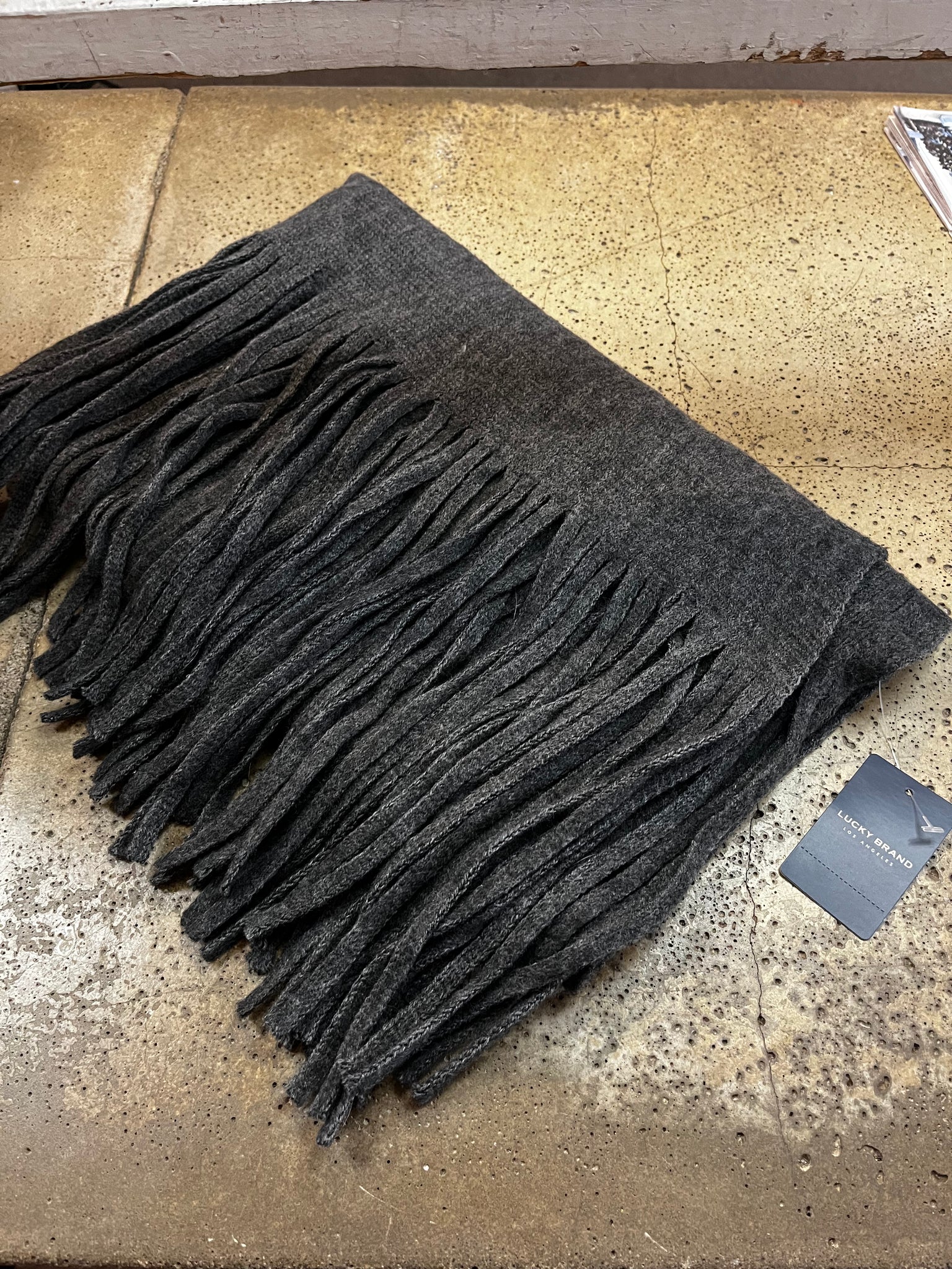 Wrap yourself in style with this NWT Lucky Brand Scarf! Made from soft, dark grey fabric, this scarf features long fringe and comes with original tags. Perfect for adding a touch of personality to any outfit. Get ready to stay cozy and on-trend with this Lucky Brand scarf.