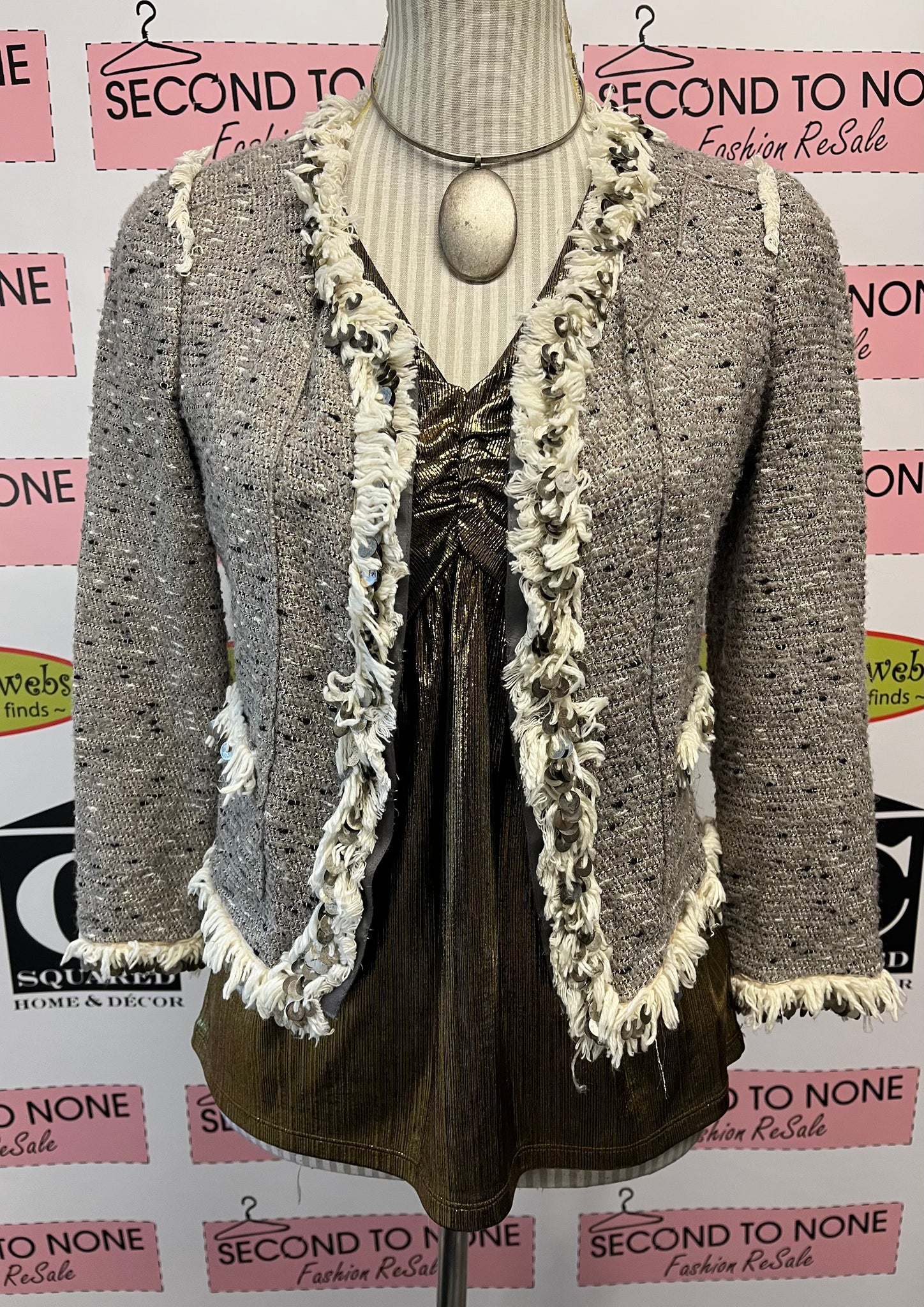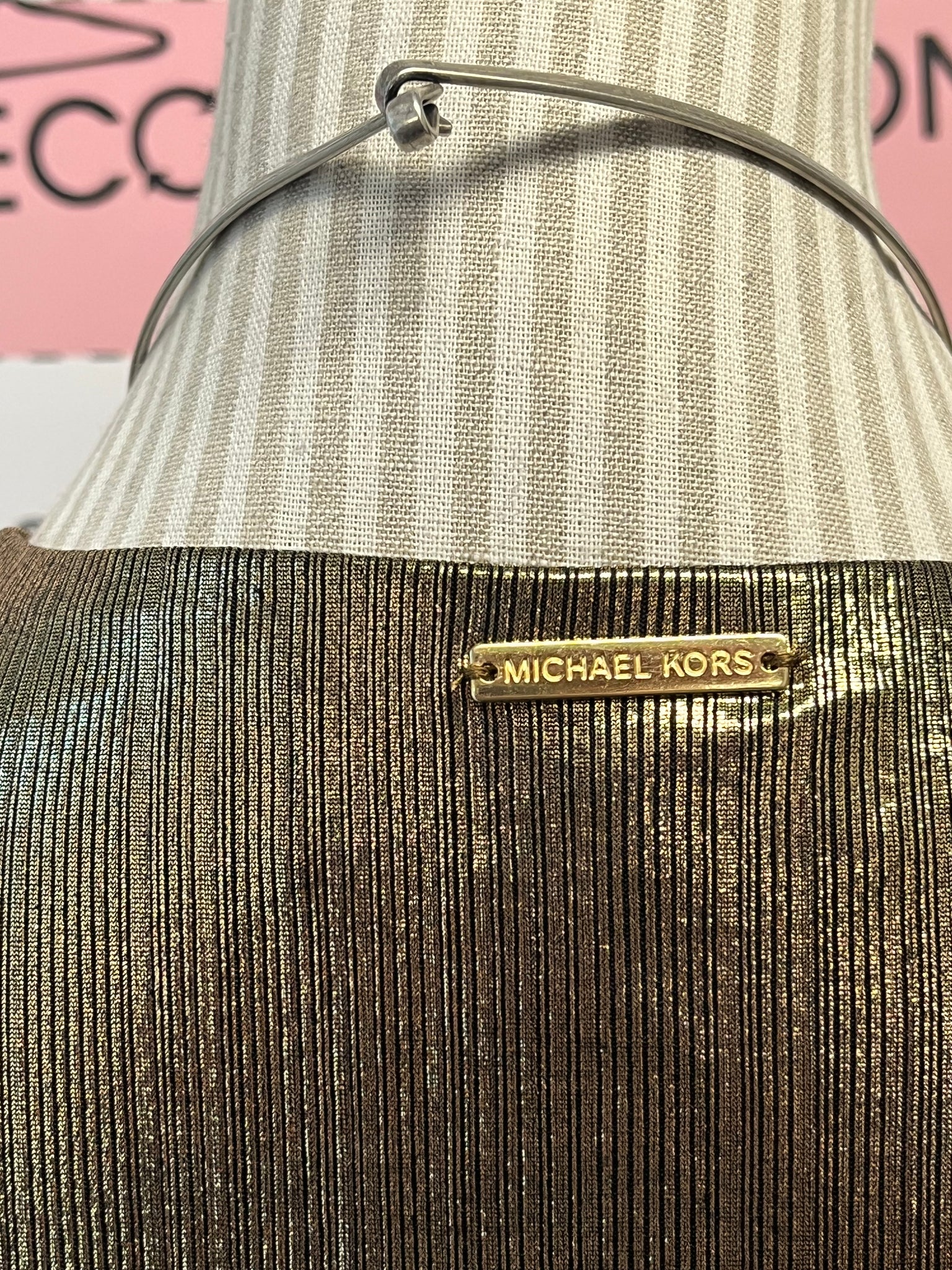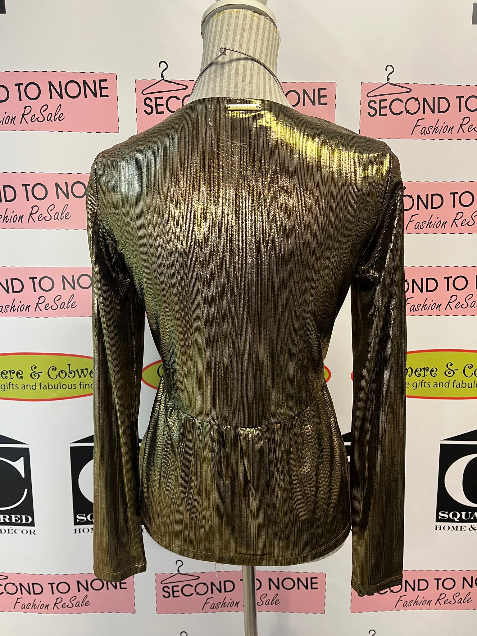 Turn heads in this bold gold shimmer top by Michael Kors! Featuring a playful ruched front and flattering v-neck, this long-sleeve beauty adds a touch of sparkle to your wardrobe. Brand new with tags, it promises style and sophistication for any occasion—all for less than the original $135 price. Grab this size S gem and shine bright!