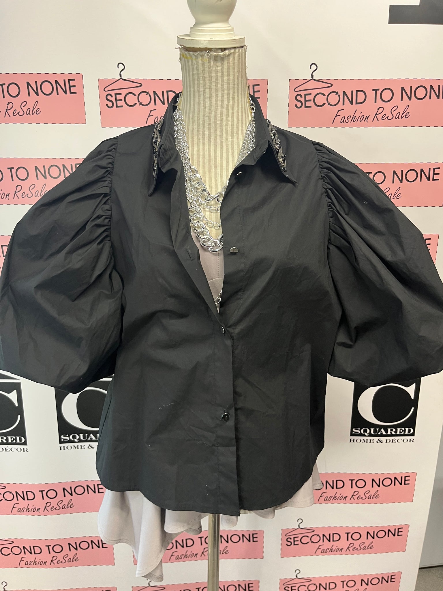 Add a touch of fun to your look with this crisp black cotton blend top. Featuring a button front and short extra-puffy sleeves, it effortlessly balances casual and chic. The neckline's chain and shiny black beads add a bit of sparkle, making it perfect for evenings out or dressing up your favorite jeans. Elissia Europe brand. 79% cotton/18% polyamide/3% elastane,