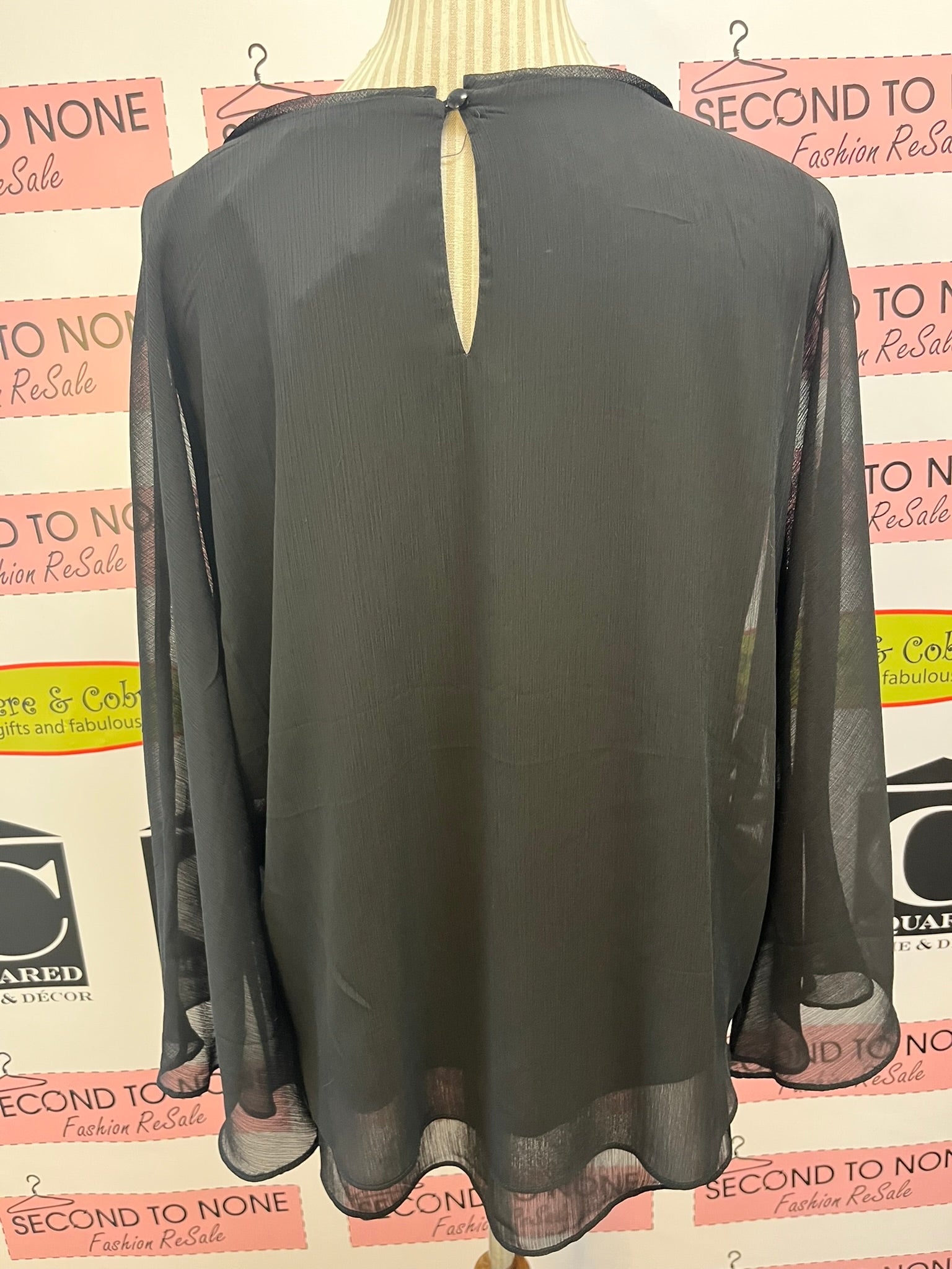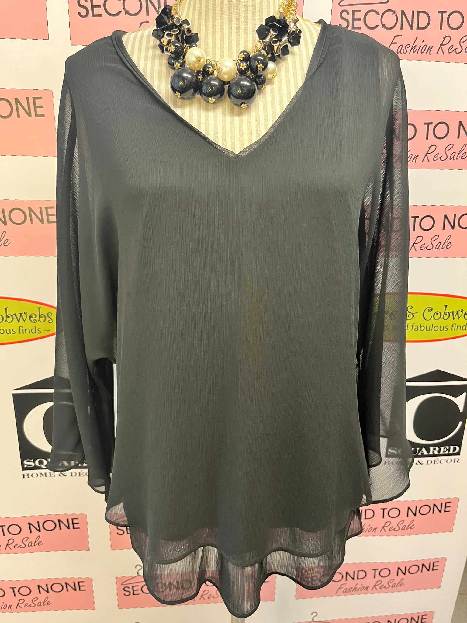 This versatile Sioni top in solid black combines a chic layered design with long sheer sleeves for a playful yet elegant look. New with tags, it’s perfect for dressing up or down, making it a fun addition to any wardrobe. Size L and ready to shine!