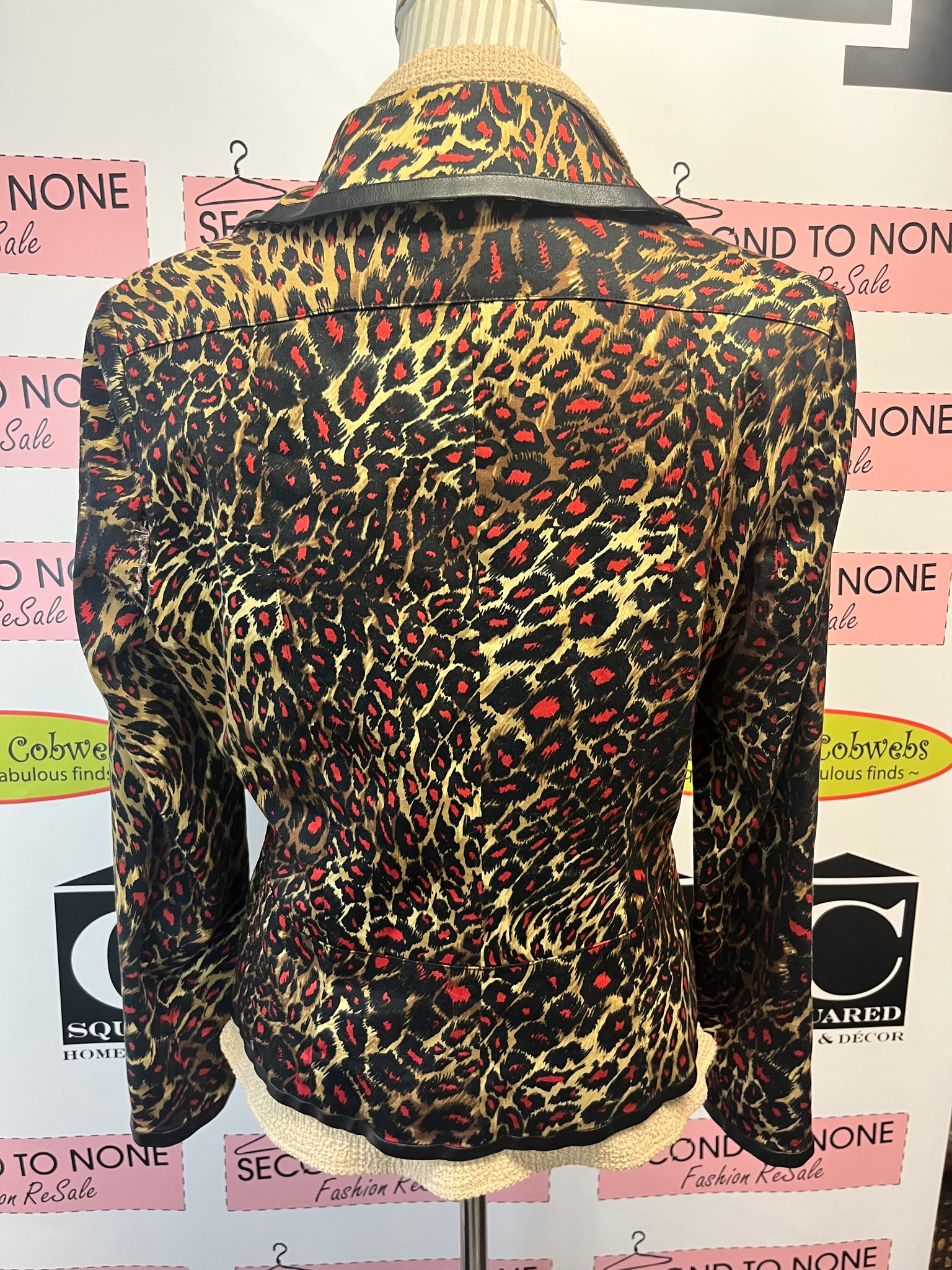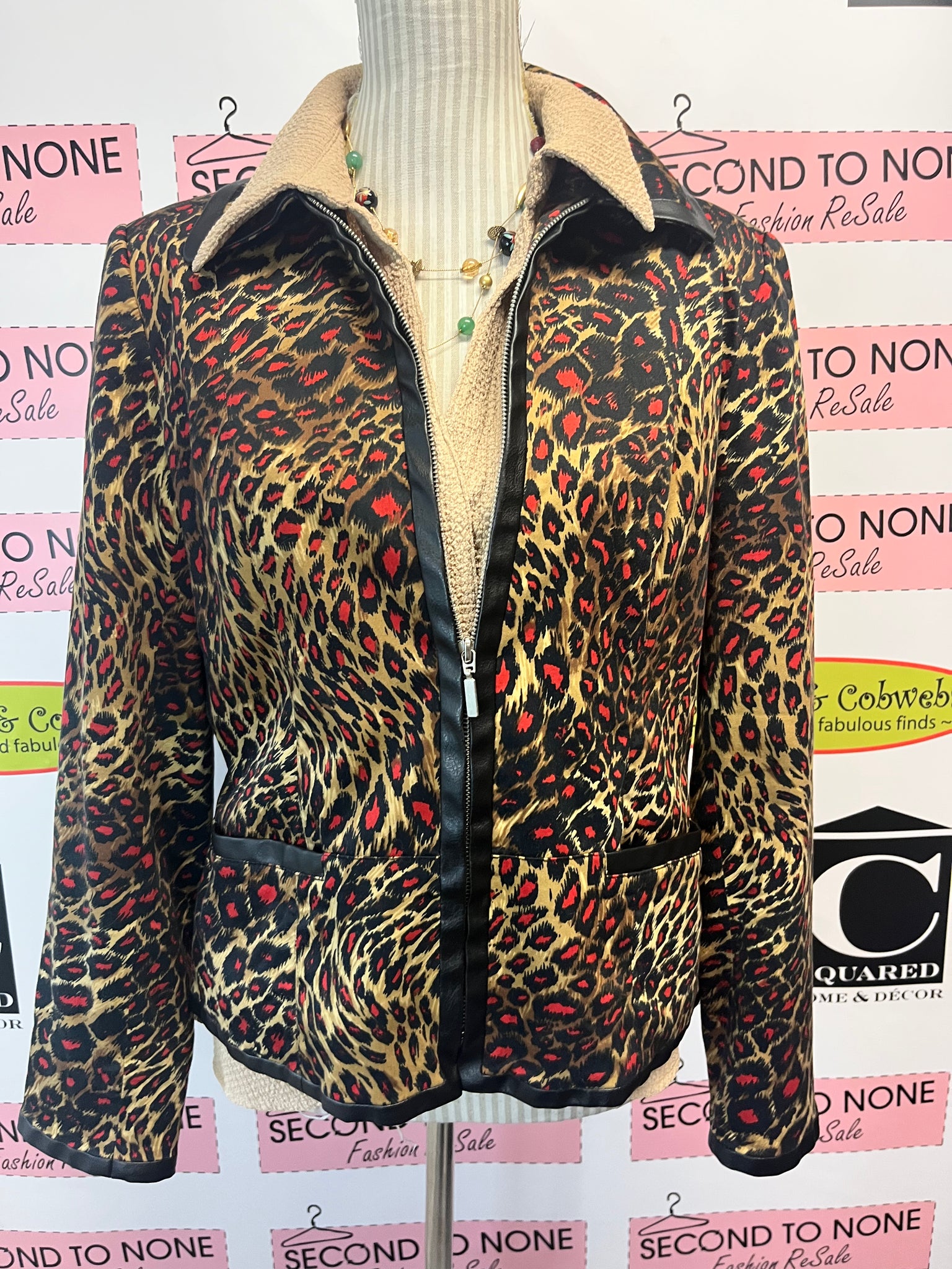 Step out with a wild twist in this vintage Nygard jacket. Crafted from a cozy cotton blend, it features a zip-up front and edgy faux leather trim. The beige, black, and red animal print brings playful energy to any outfit, making this size 10 piece a standout addition to your wardrobe. Embrace bold style with comfort and attitude!