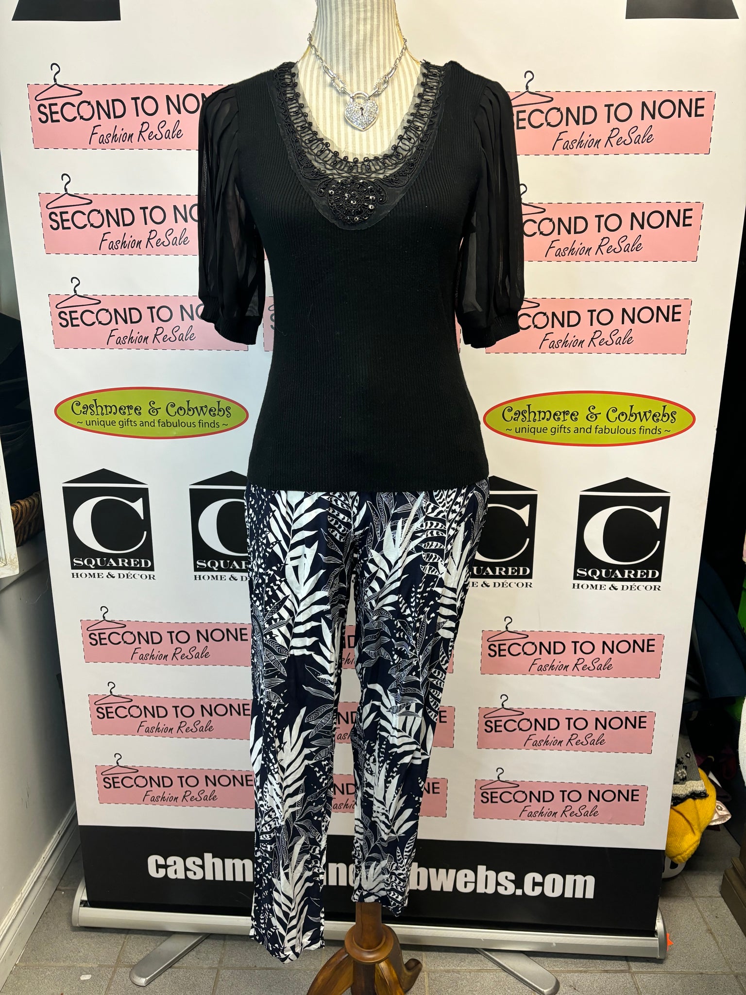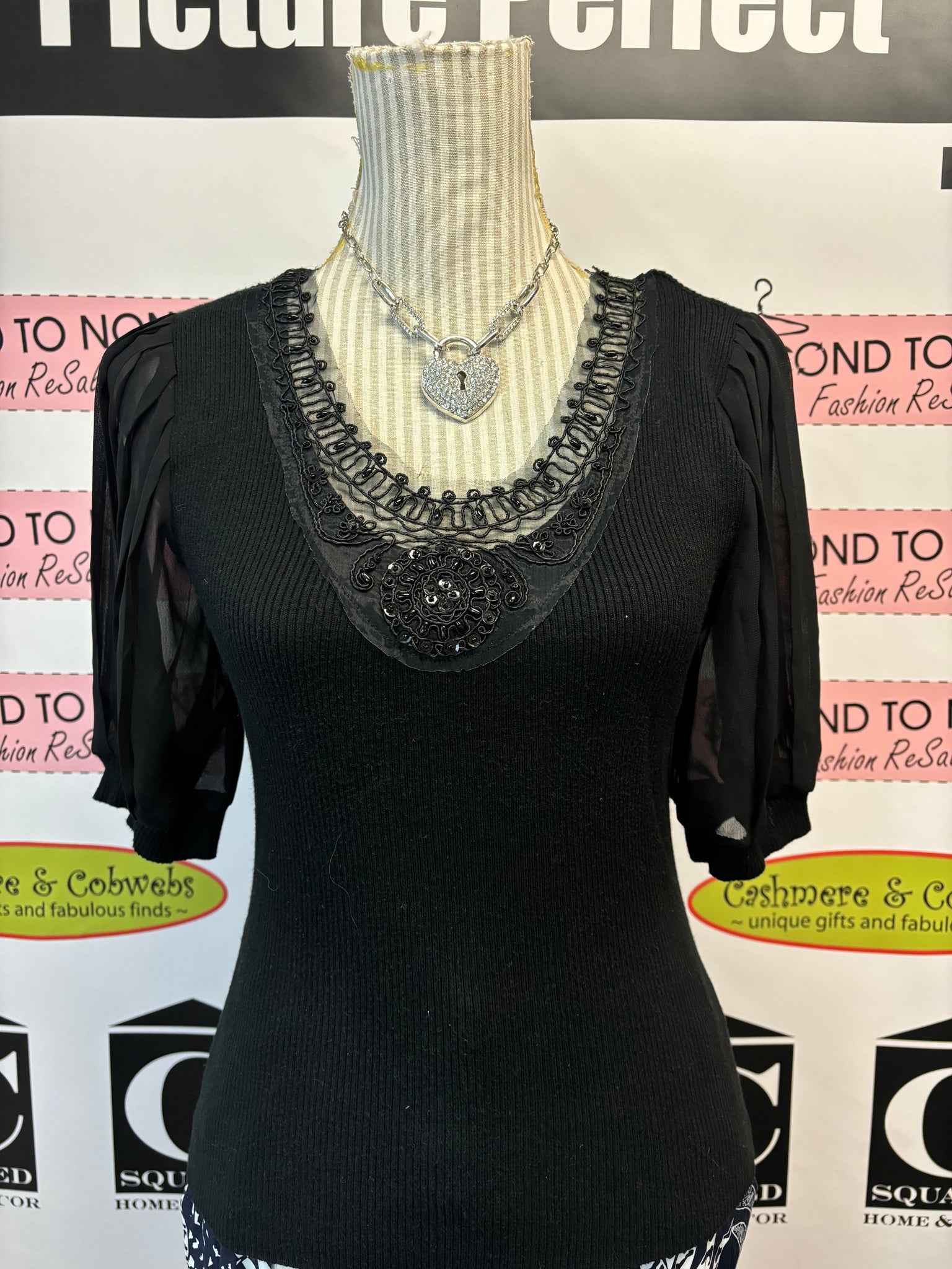 Dress to impress with the Nygard Beaded Top. This black top features a fancy beaded neckline and sheer bell sleeves accented with delicate lace trim. Made with elastic stretchy and ribbed material, this top is both classy and comfortable. Perfect for a show-stopping date night or a night at the theatre.