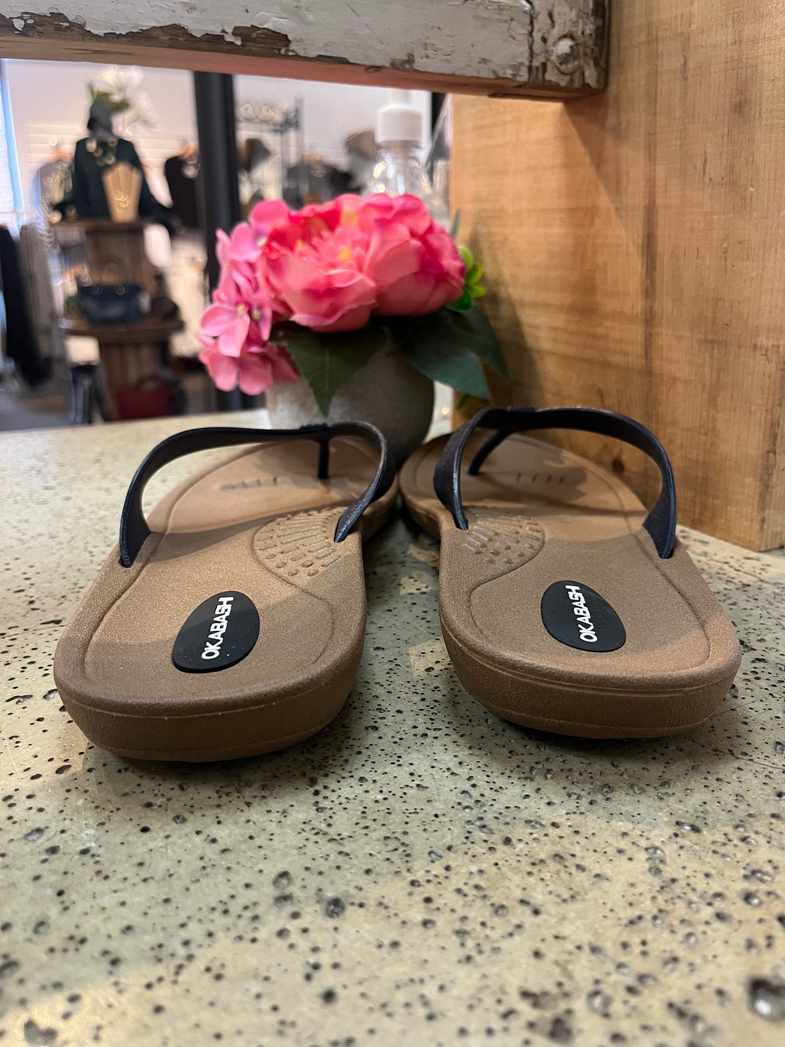 Get ready for summer with the Okabashi Flip Flops! These flip flops are not only stylish with their brown base and navy blue straps, but also comfortable with arch support and reflexology beads on the inner foot. Plus, the 1 inch platform at the heel means you won't feel a thing you step on. No more uncomfortable flip flops, just fun in the sun! (Indicated as size large, fits a womens size 10).