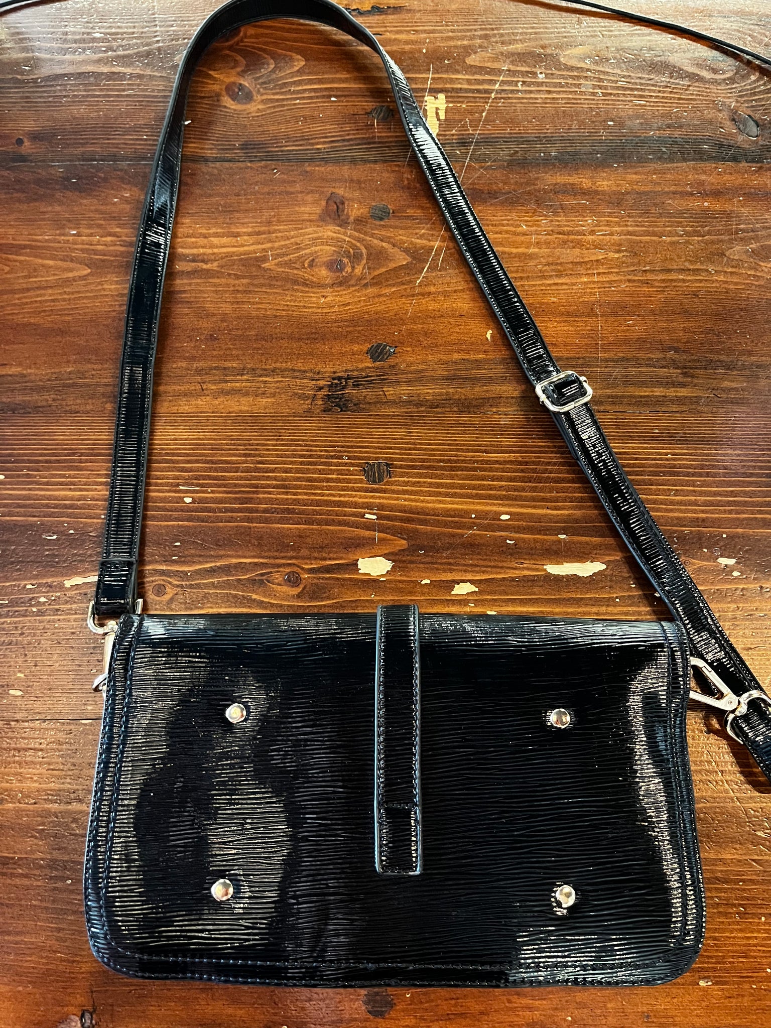 Elevate your style with the Olsen Double Pouch Crossbody. Made from shiny, vinyl-like material, this crossbody features silver buckle detailing and studs for added flair. Its double zippered pouch and adjustable/removable strap make it perfect for a city stroll or date night at the theatre.
