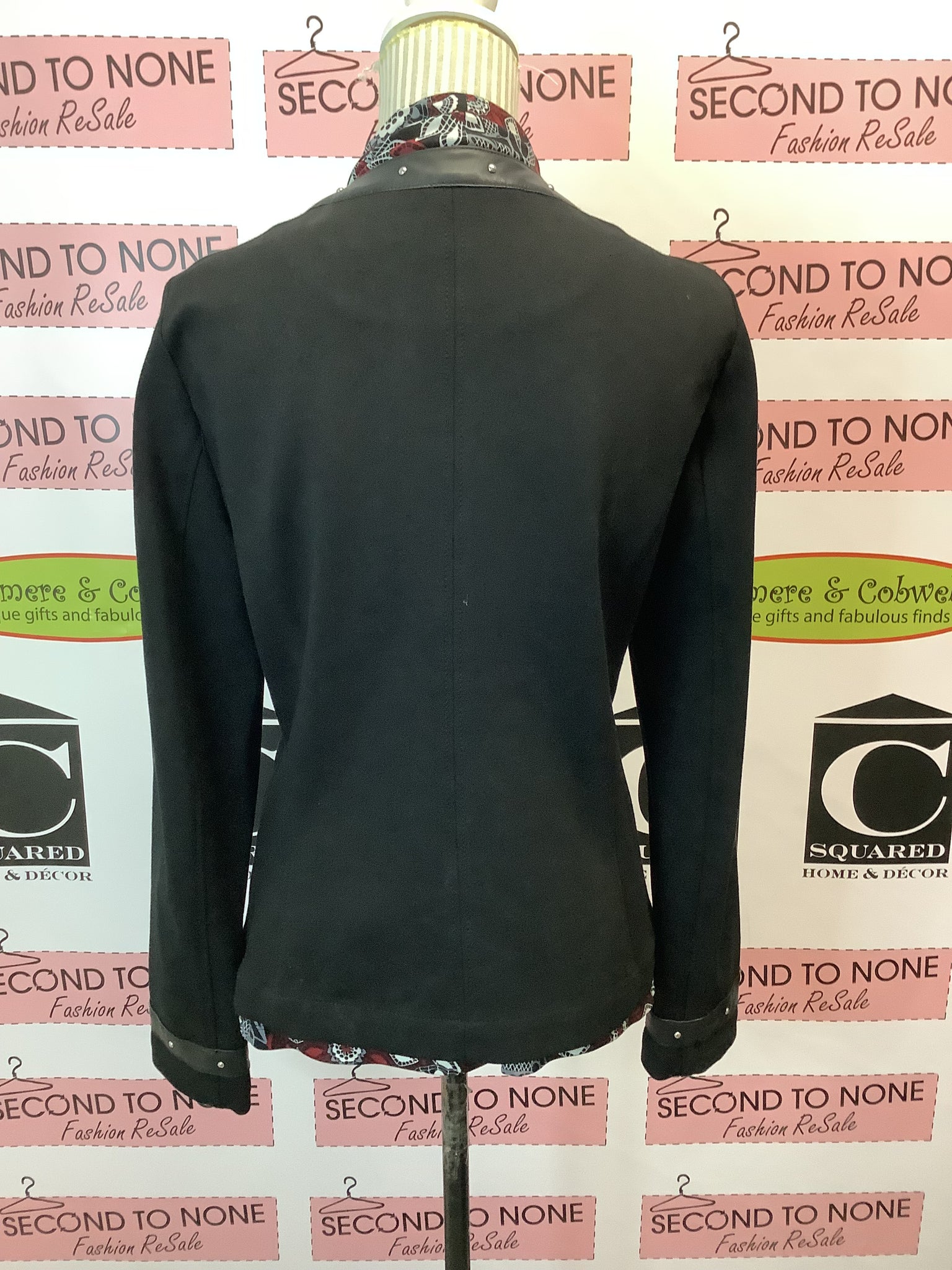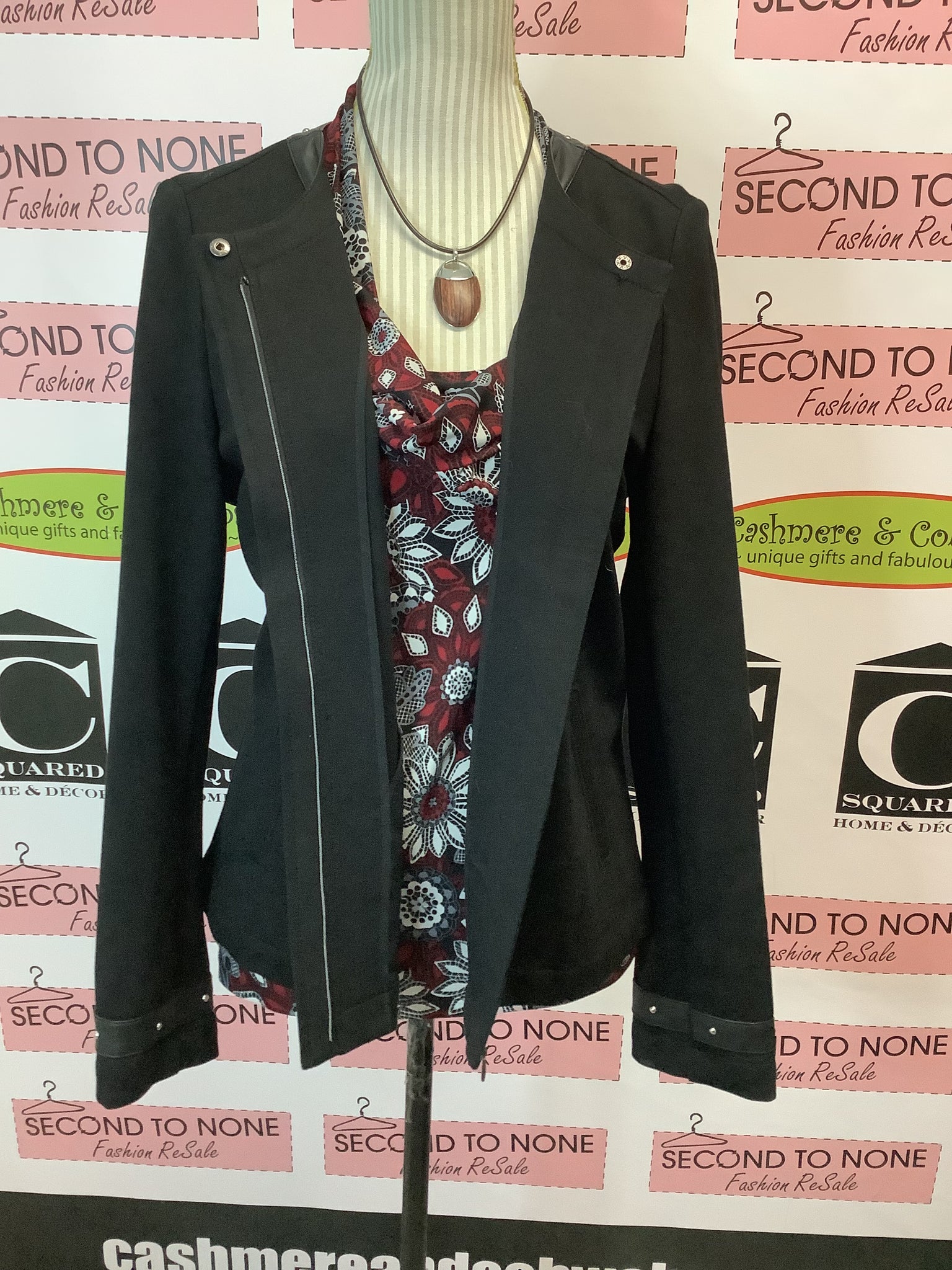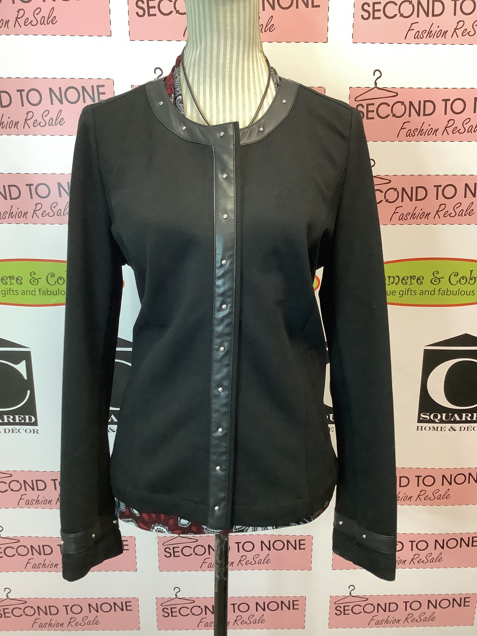 Upgrade your wardrobe with the Olsen Studded Cropped Jacket. It's lightweight and edgy with black faux leather contrast and silver studs. The zip-up front can be worn open or closed, giving you versatile style options. Add a unique touch to any outfit with this awesome jacket.